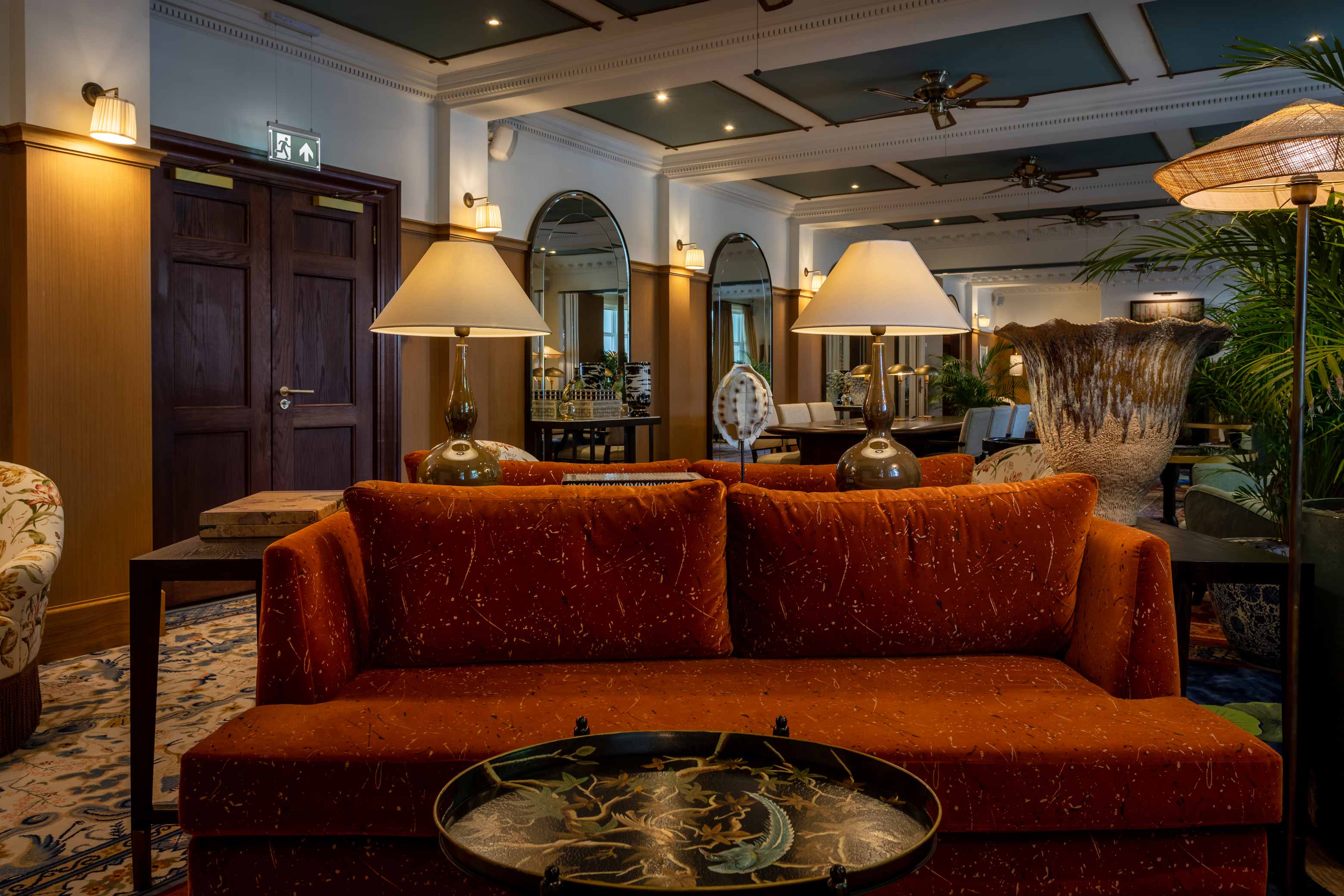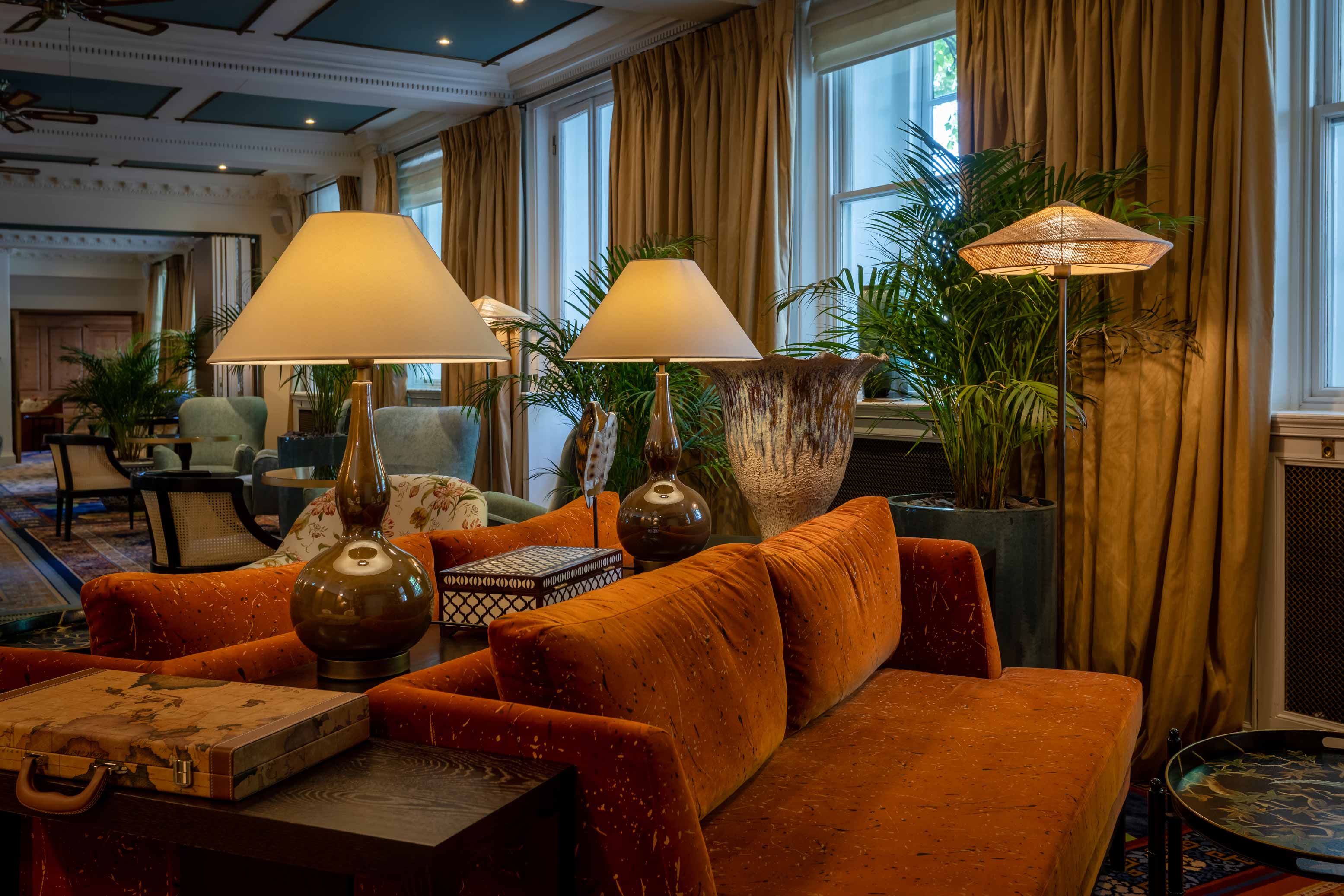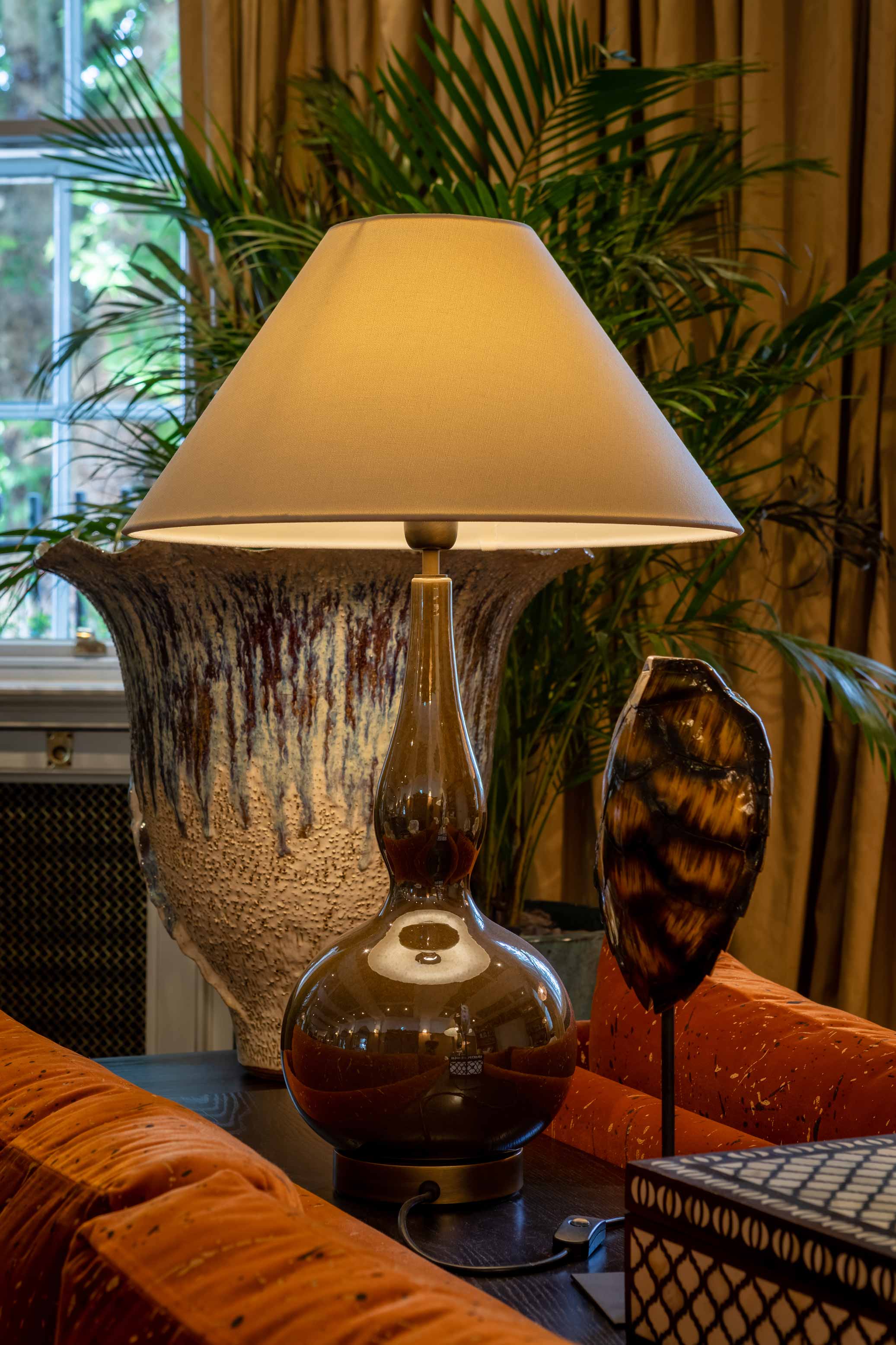 Elegant, expansive and inspiring, The Palm Court is the hotel's dedicated space for creative co-working. Originally a 19th-century town coffee house, this long salon with high ceilings and river views has been transformed into the dramatic Palm Court with planter fans, giant mirrors and a mosaic of Persian rugs, with small cluster seating for both work and leisure encounters. The chic red sofa benefits from the comforting aura of two lamps from our Signature Collection. The reactive glaze we use to finish Borges' beautiful ceramic body ensures that each one is different from the last. Sitting atop an Old English Brass base, this eye-catching lamp is shown in Olive-coloured ceramic.