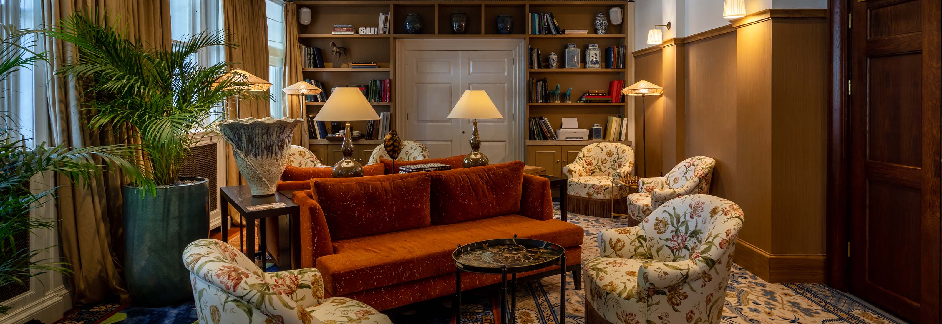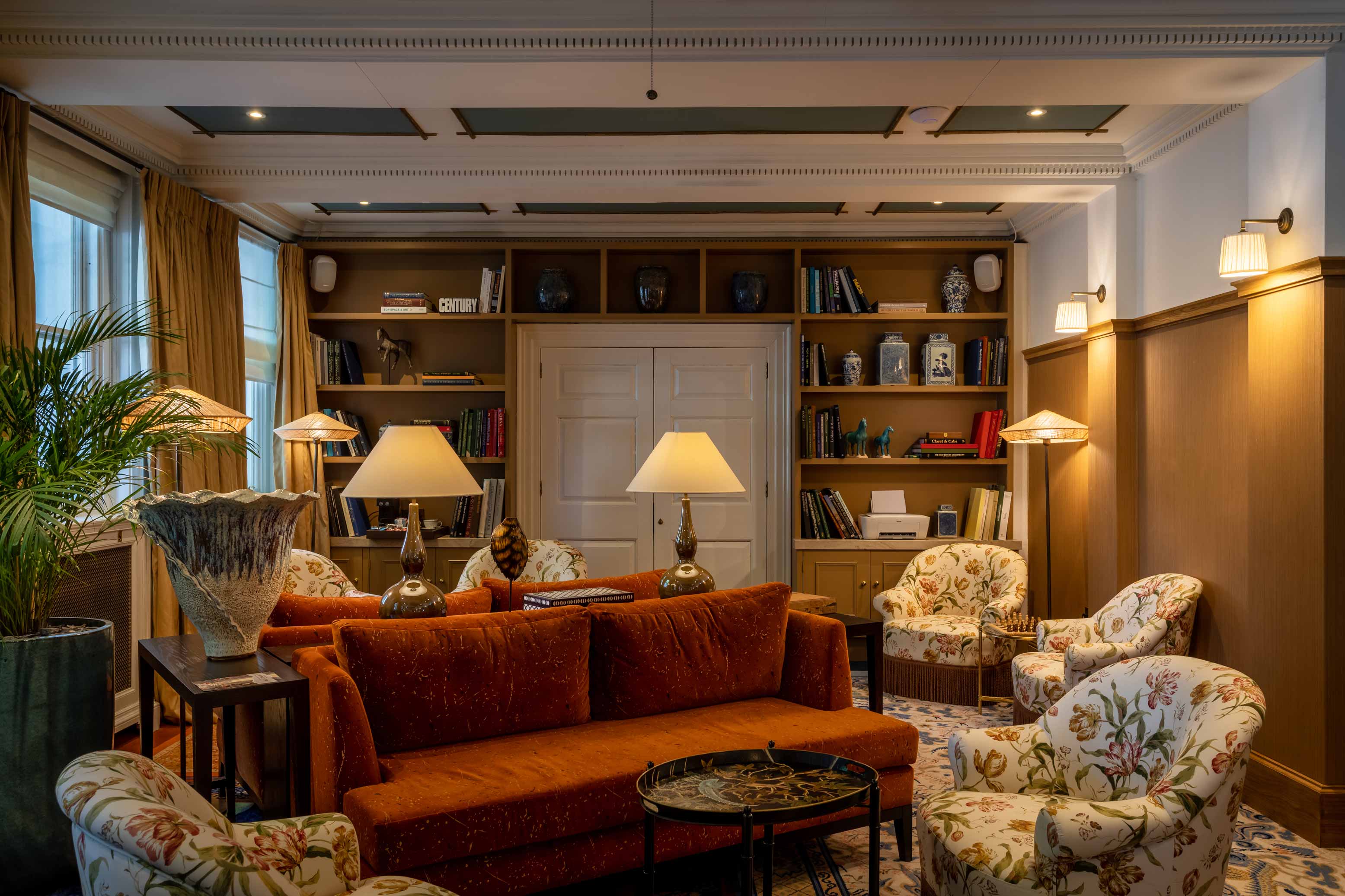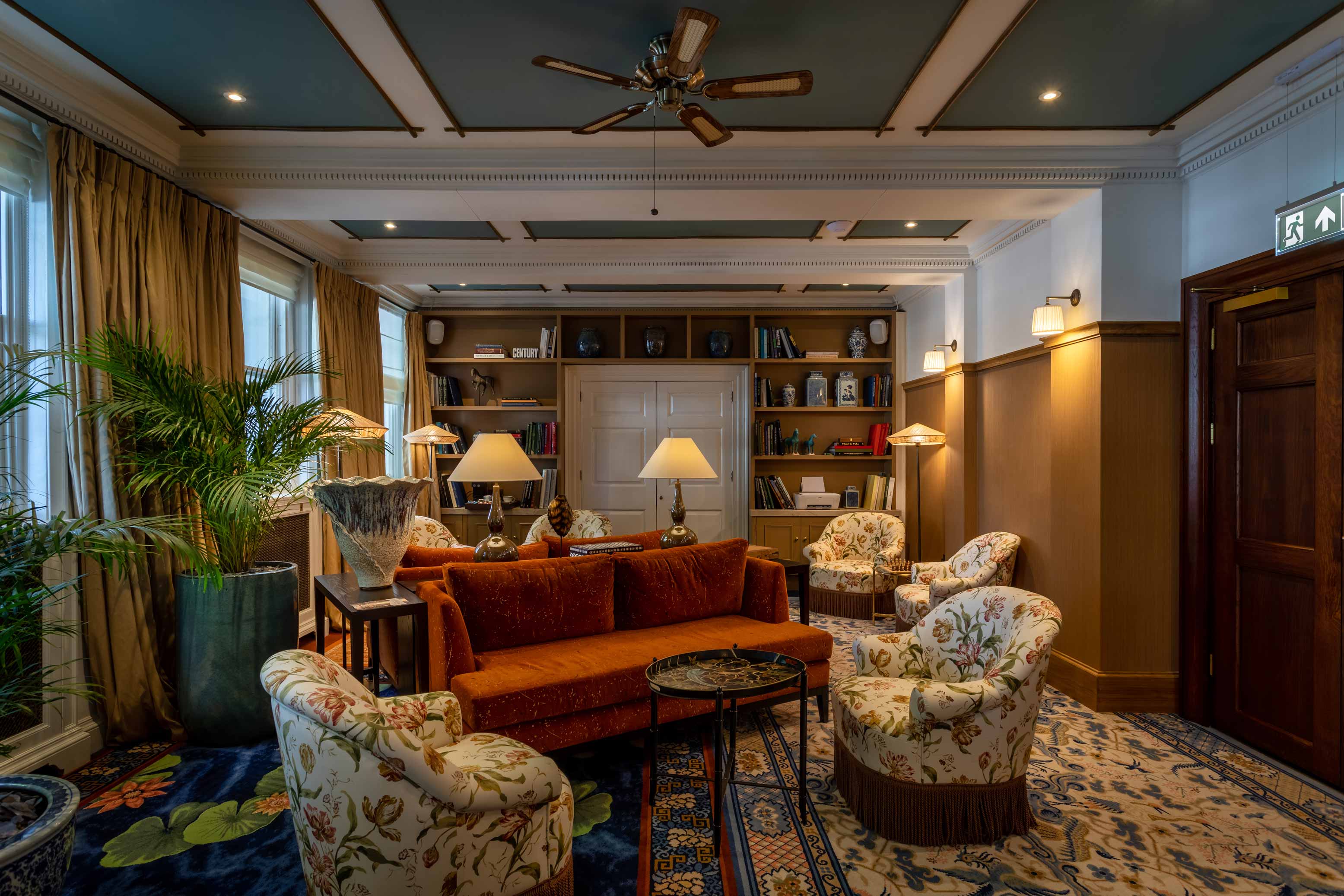 Elegant, expansive and inspiring, The Palm Court is the hotel's dedicated space for creative co-working. Originally a 19th-century town coffee house, this long salon with high ceilings and river views has been transformed into the dramatic Palm Court with planter fans, giant mirrors and a mosaic of Persian rugs, with small cluster seating for both work and leisure encounters. The chic red sofa benefits from the comforting aura of two lamps from our Signature Collection. The reactive glaze we use to finish Borges' beautiful ceramic body ensures that each one is different from the last. Sitting atop an Old English Brass base, this eye-catching lamp is shown in Olive-coloured ceramic.