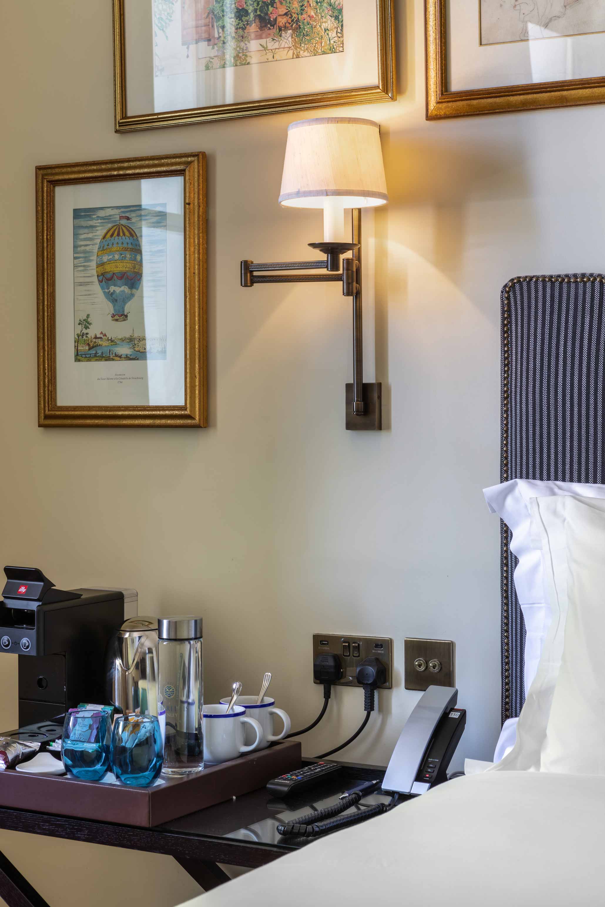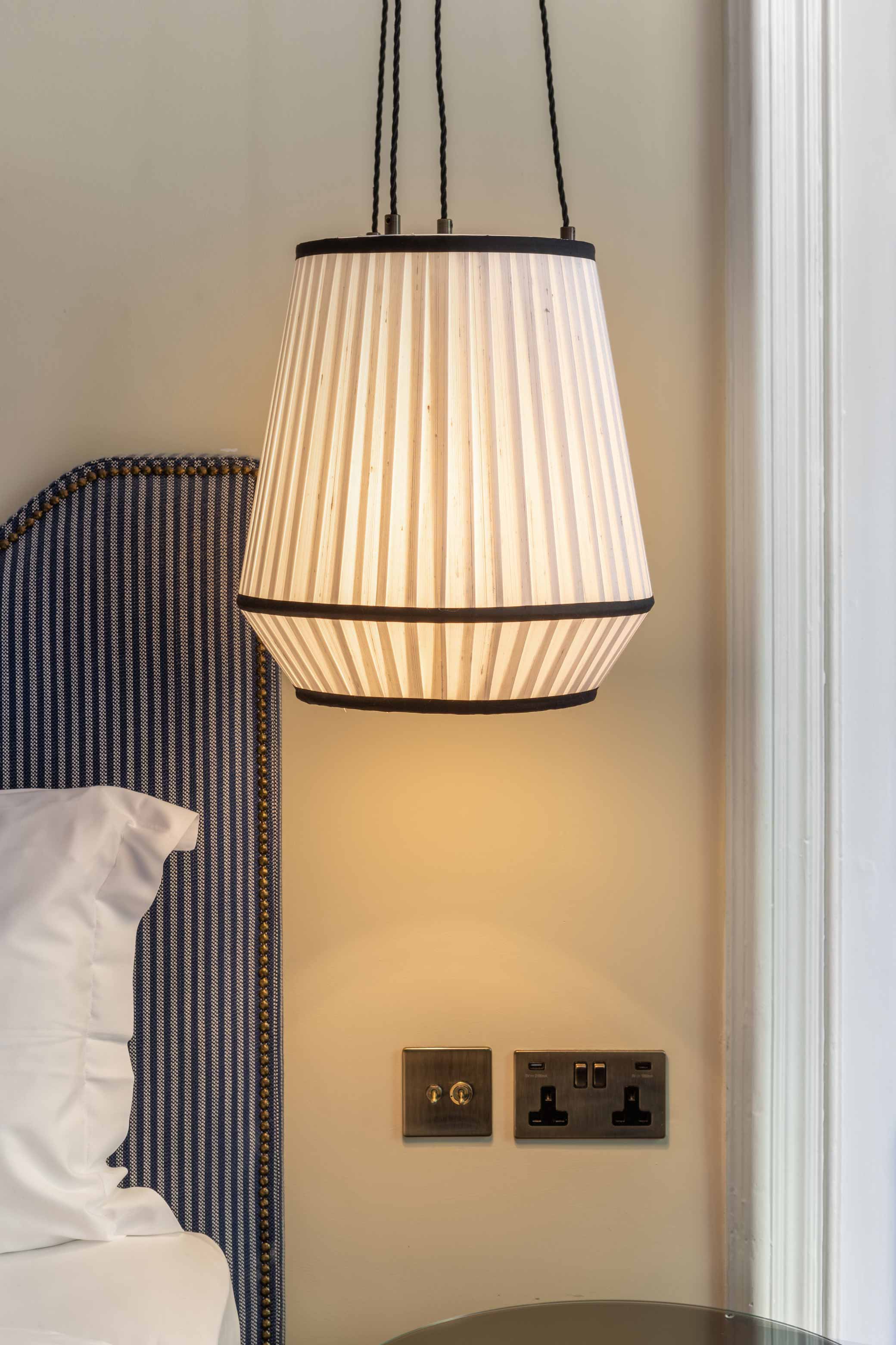 On the other side of the bed, our swing-arm candle wall lamp gives a subtle nod to the room's original source of lighting from hundreds of years ago. The decorative cast brass swing arm enables the light to utilise several positions, meaning that guests can divert focus to the nearby framed pictures or the bed. A white linen fabric shade diffuses the fixture's candle element.