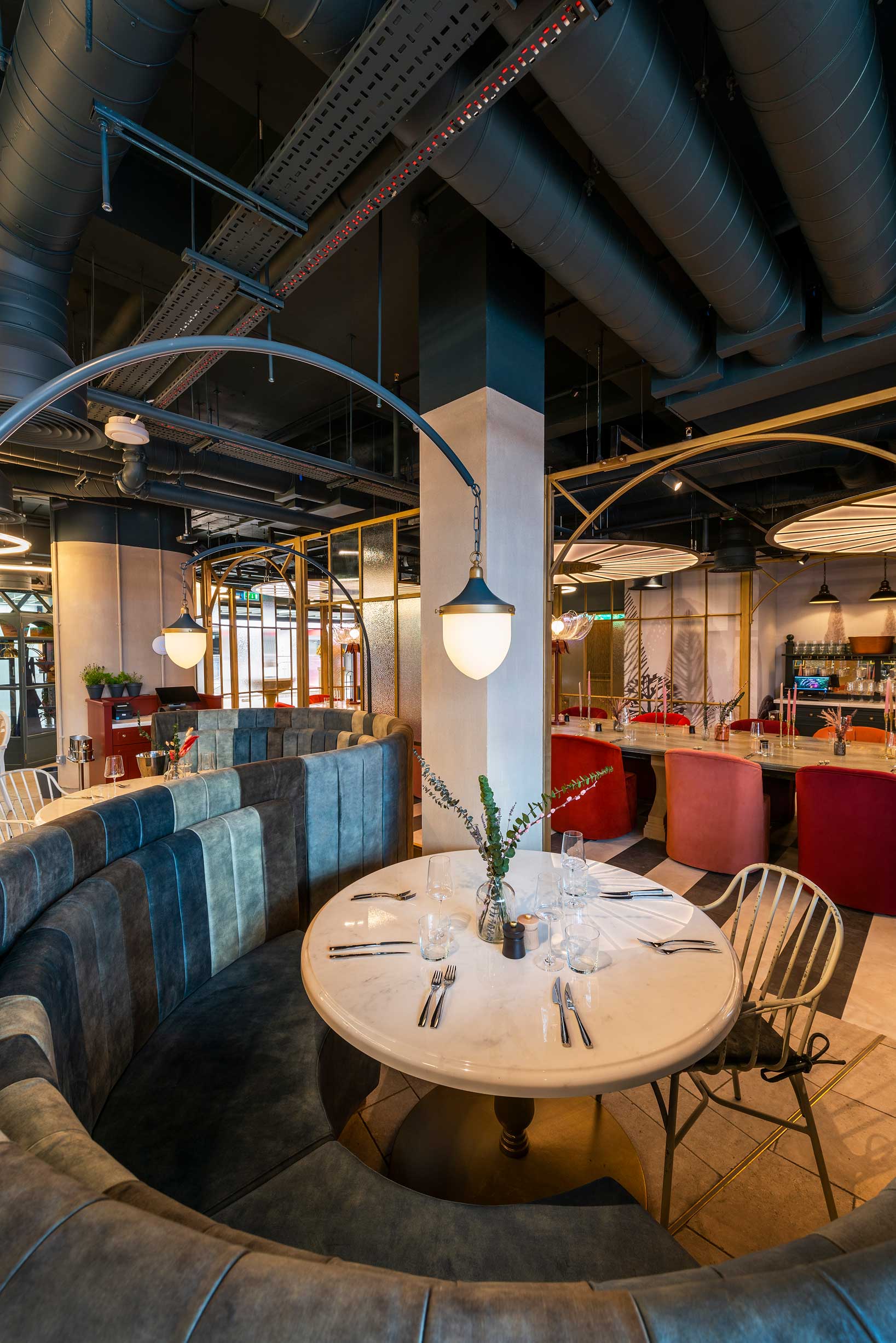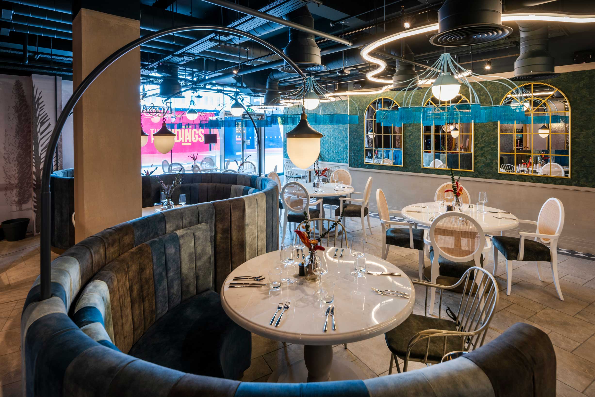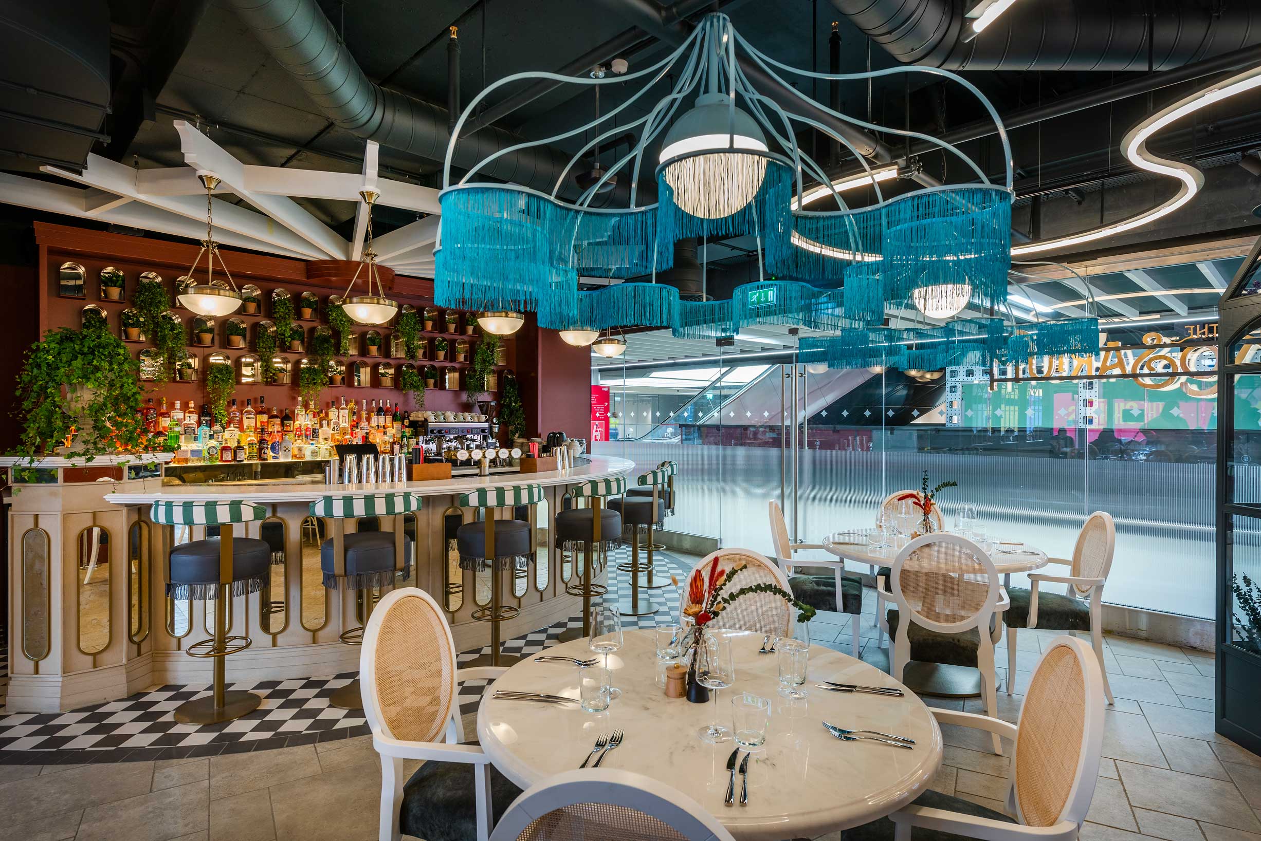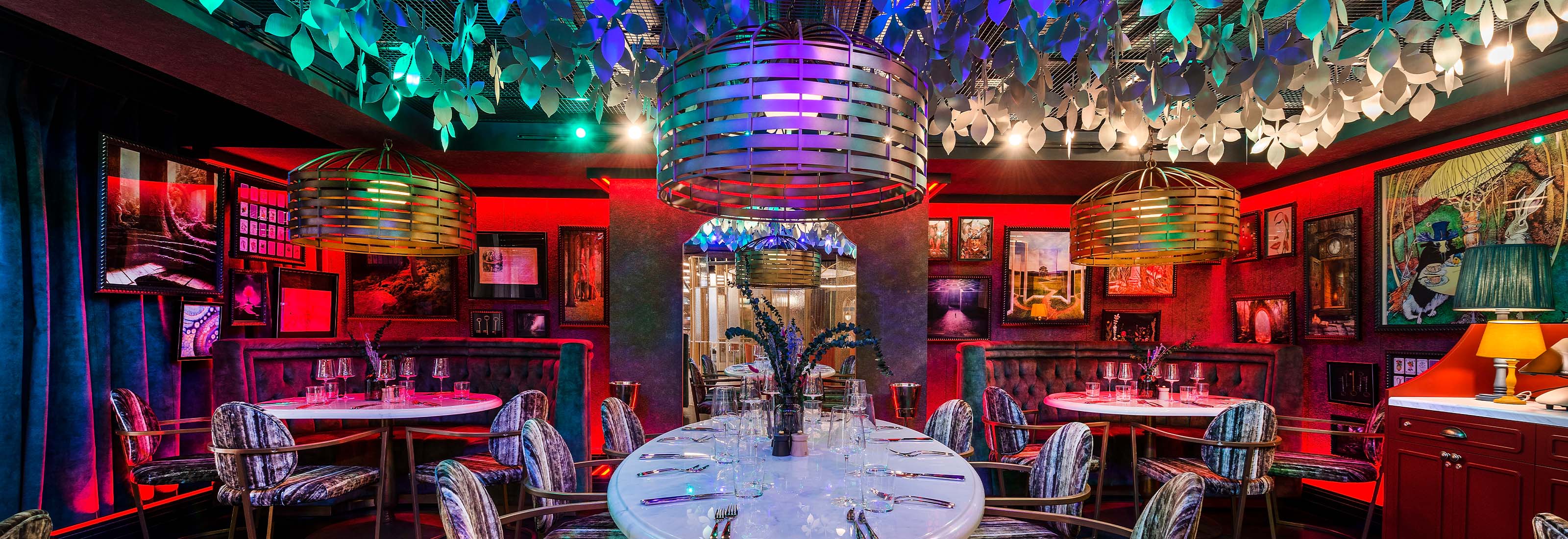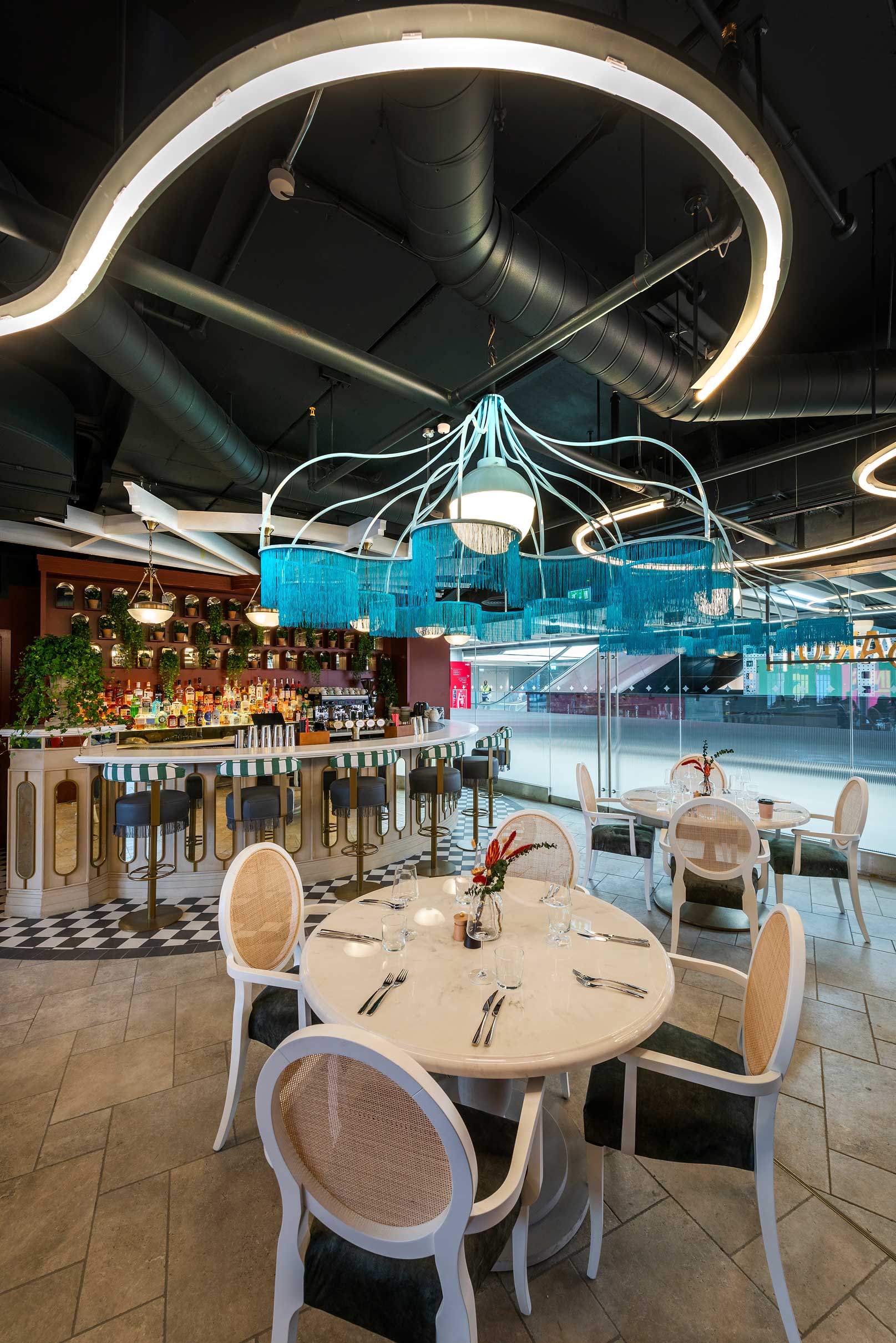 Above the individual tables, our outré granite grey & pastel turquoise parasol pendants bring eccentricity to the room. Each pendant is complete with tasselled fringes and matt opal glass globes. Finally, our neon feature light snakes across the ceiling, supported by sixteen hand-finished granite grey loop supports.