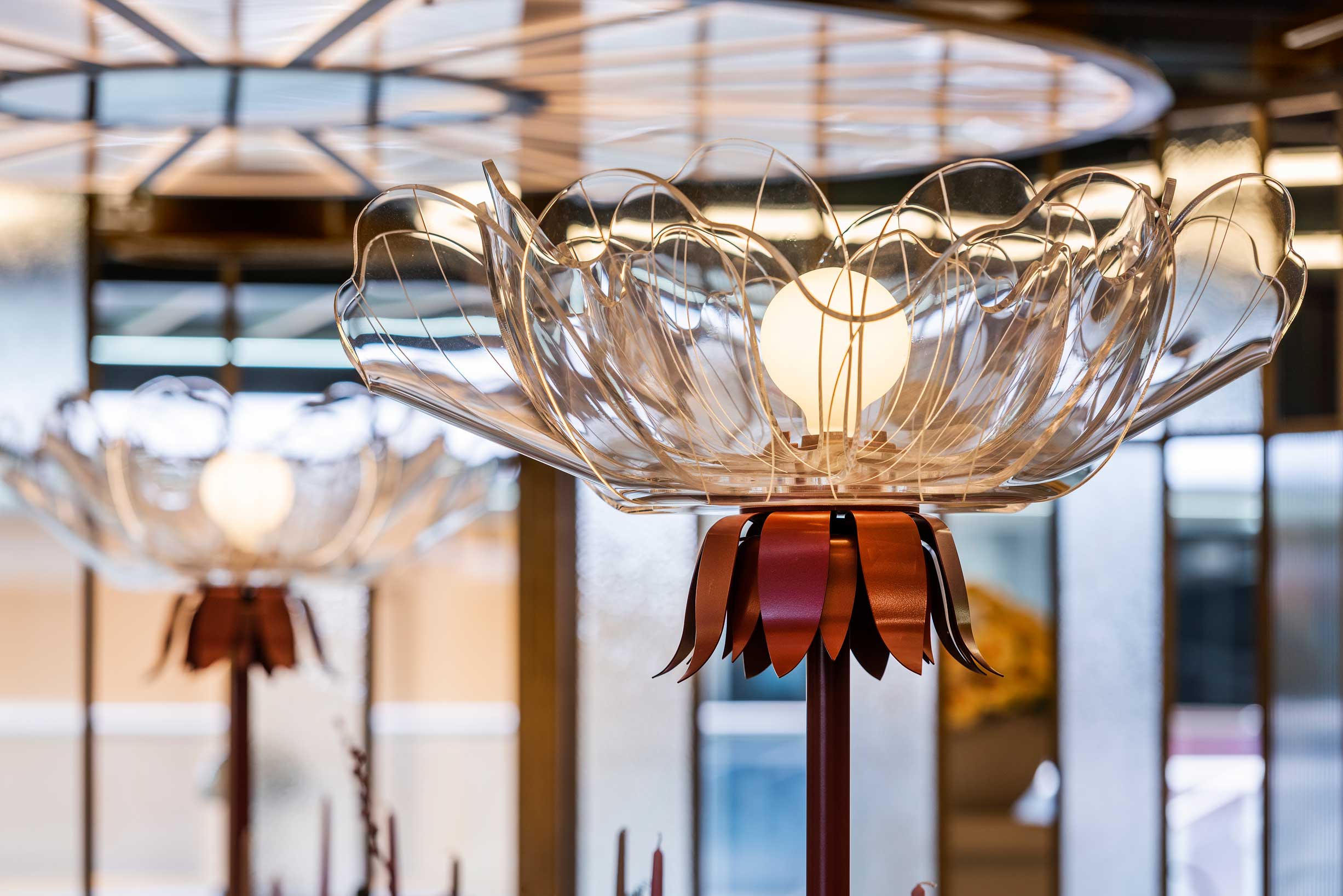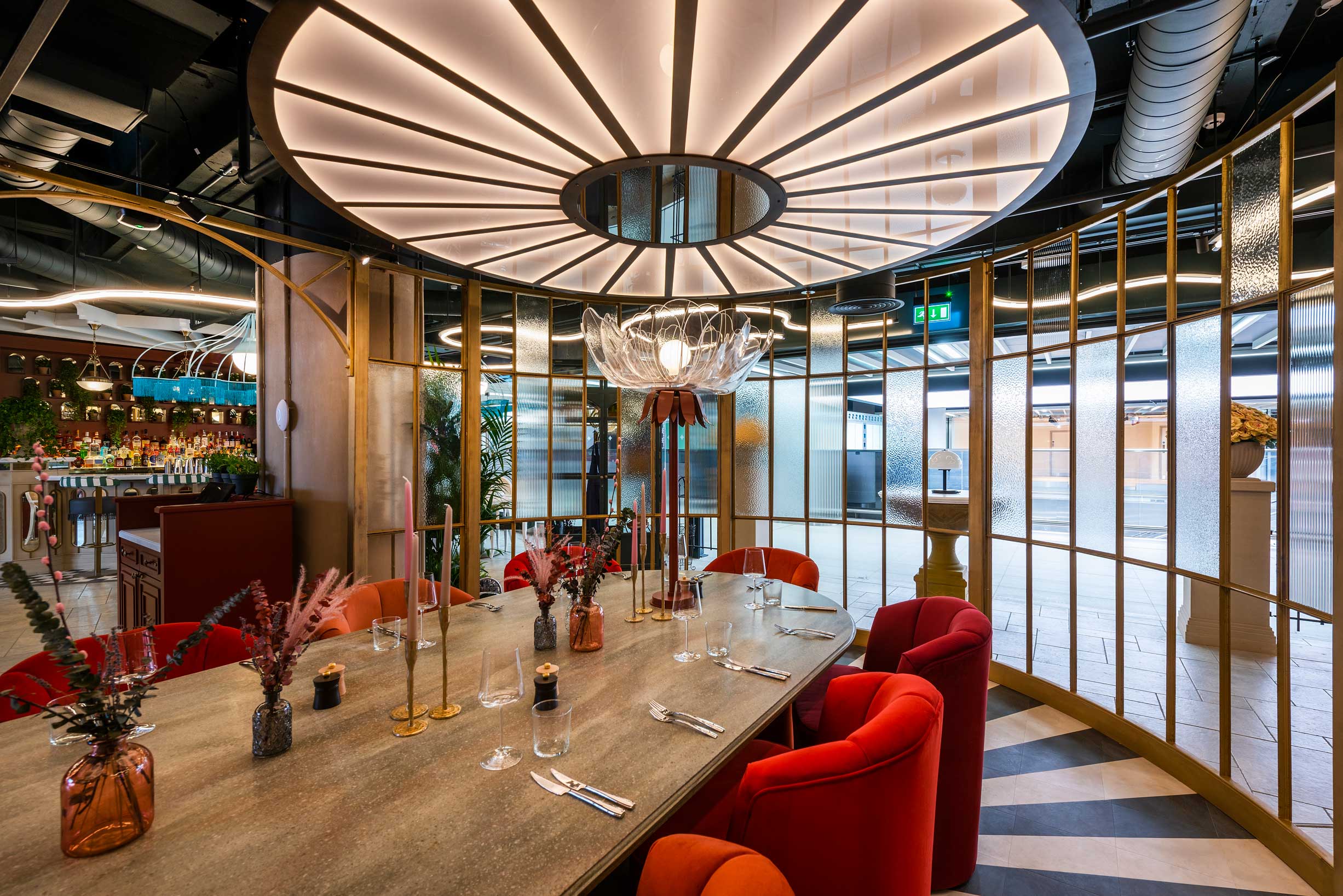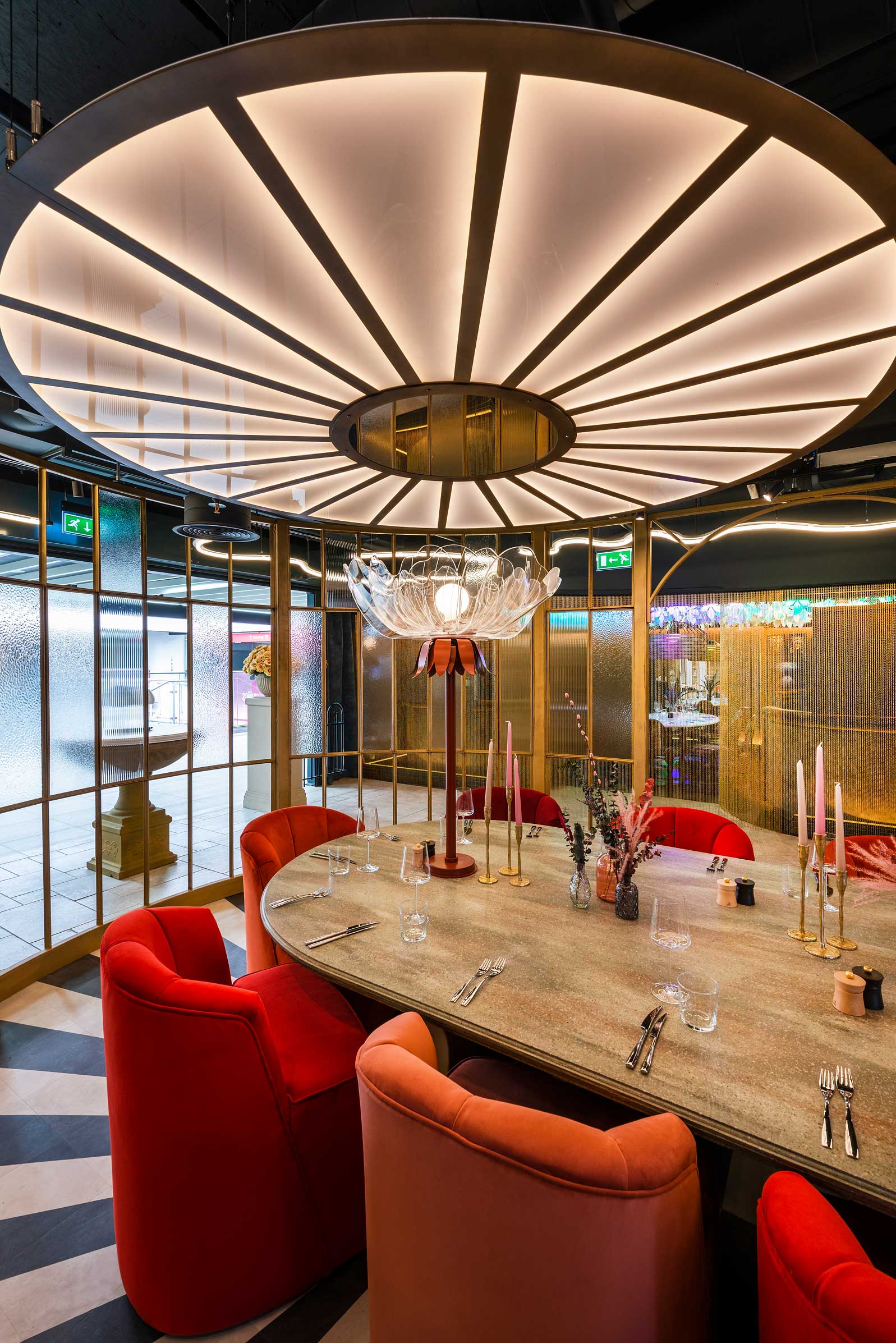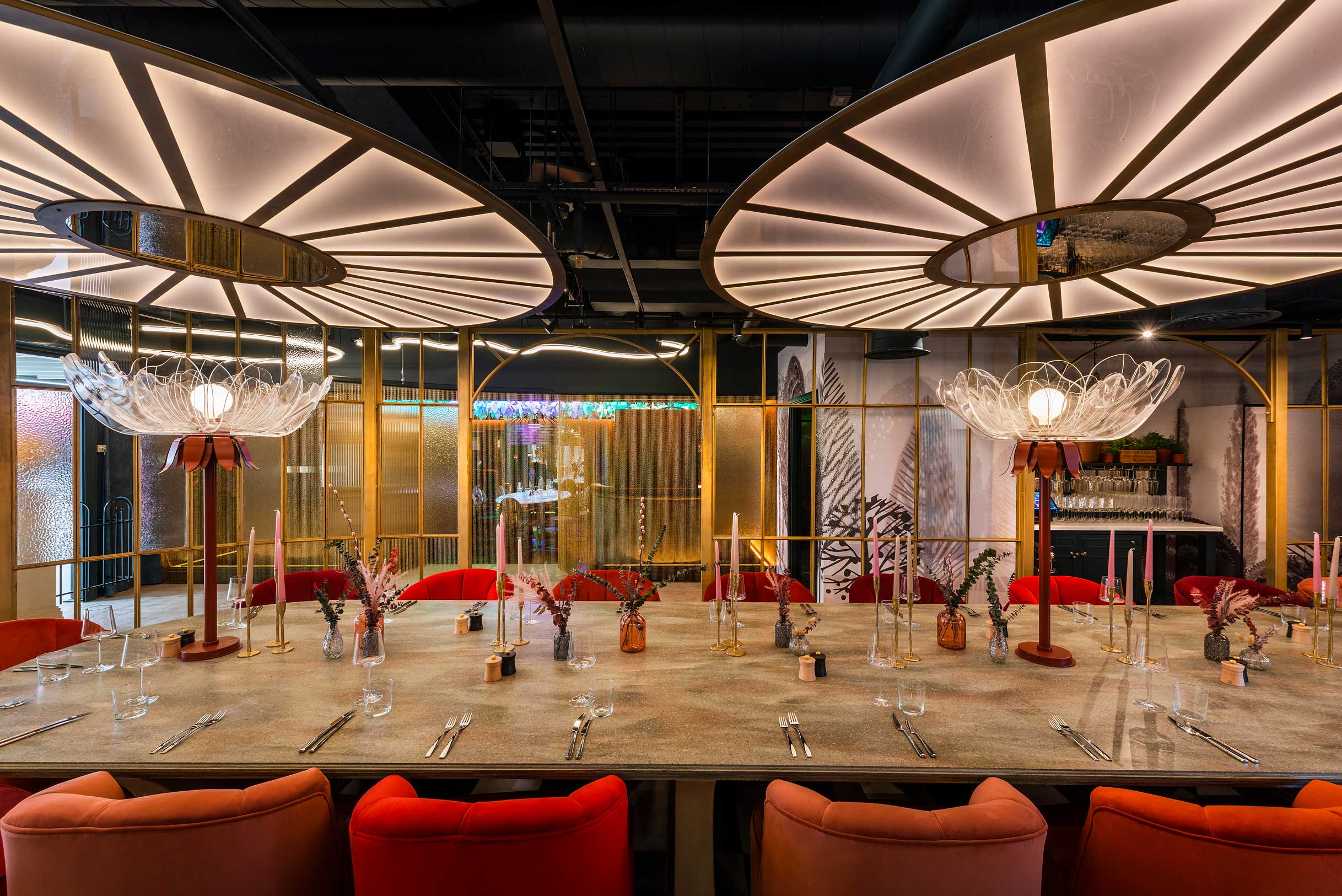 In the immersive Glasshouse, the scope of our large-scale manufacturing capabilities comes to life in the shape of 3-metre-wide feature pendants that eclipse the length of the private dining table. The incredible fixtures comprise a hand-applied medium antique brass frame with four quadrants of matt opal acrylic and a mirror-polished stainless steel central disc. The finished articles are three remarkable pendants encompassing the banquet table with the same effect as an umbrella. Beneath the pendants are three exquisite fixed floral table lamps crafted from an oxide red steel body and complemented by shaped acrylic to form petals. The table lamps have been fitted directly beneath each pendant to reflect their light in the stainless steel mirror.