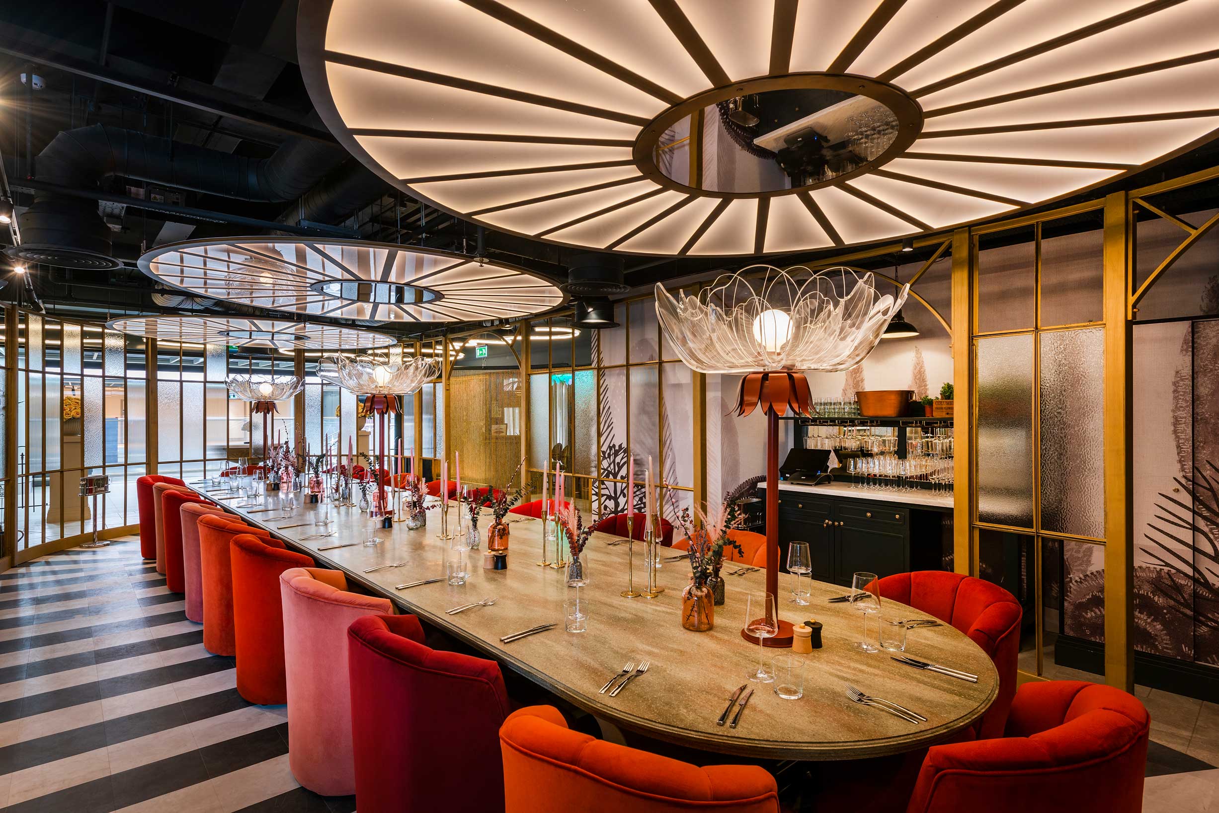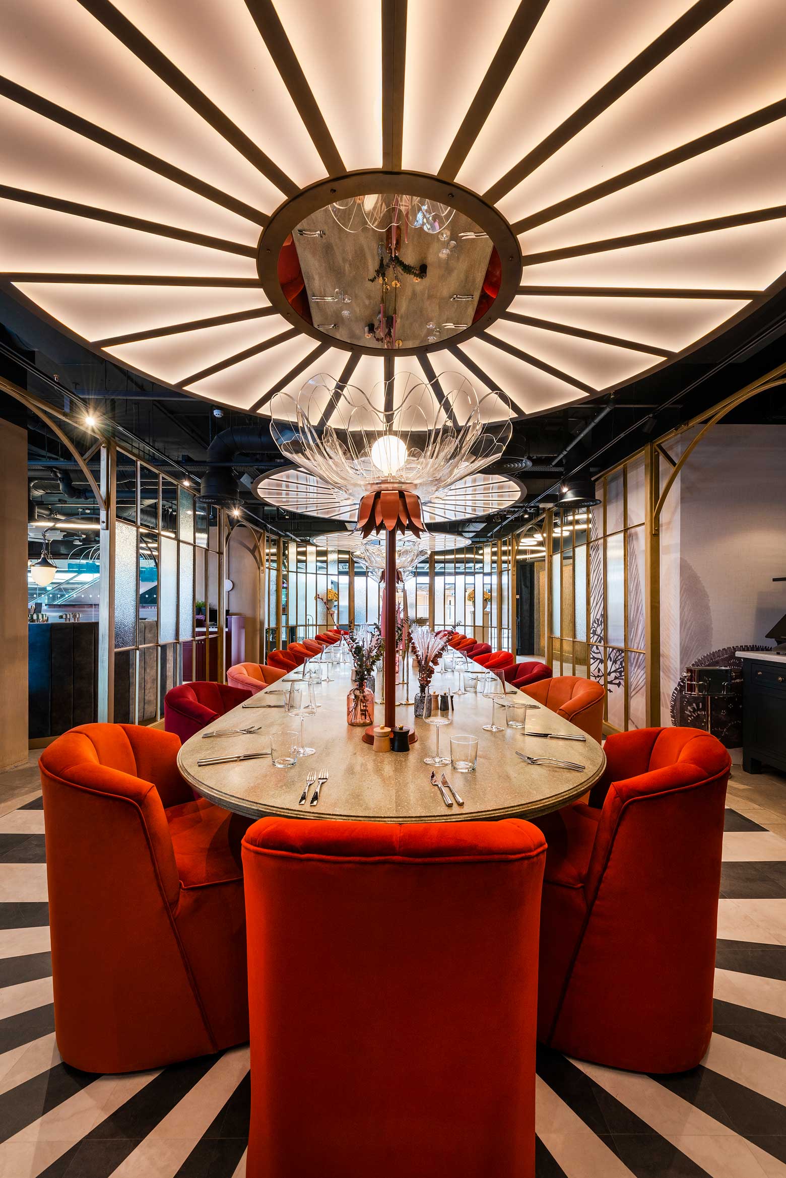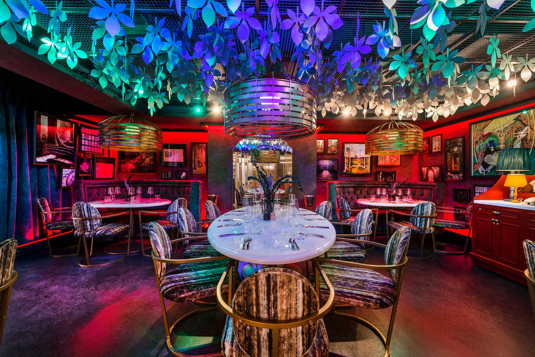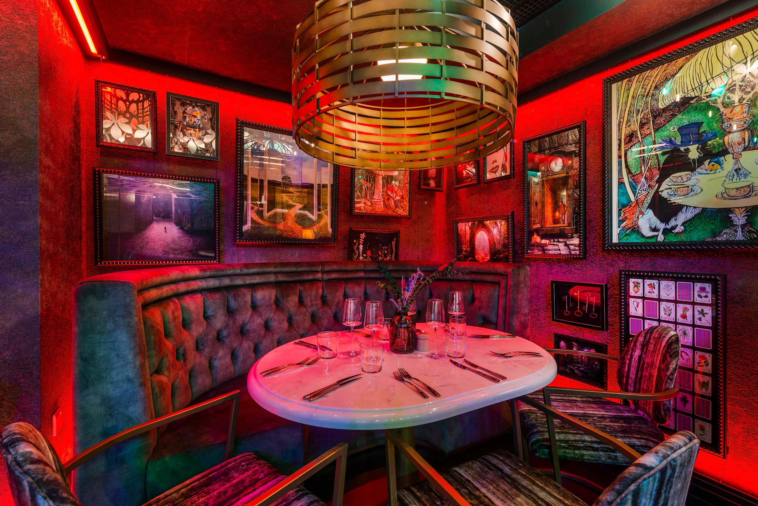 The restaurant's interiors have been imagined and realised by Faber and Company. The design draws from the architecture of the quintessential English gardens of Lewis Carroll's era, where luxury and the surreal blend to create a magical effect. Those commemorating a special occasion can choose from the venue's three dining spaces; the central Glasshouse, the indoor terrace, or for a private dining experience like no other, hide away in The Rosarium's secret garden.