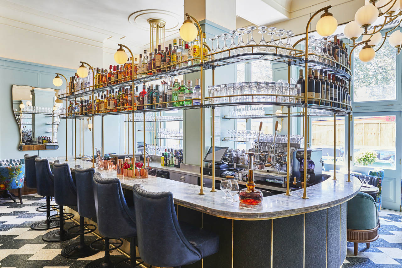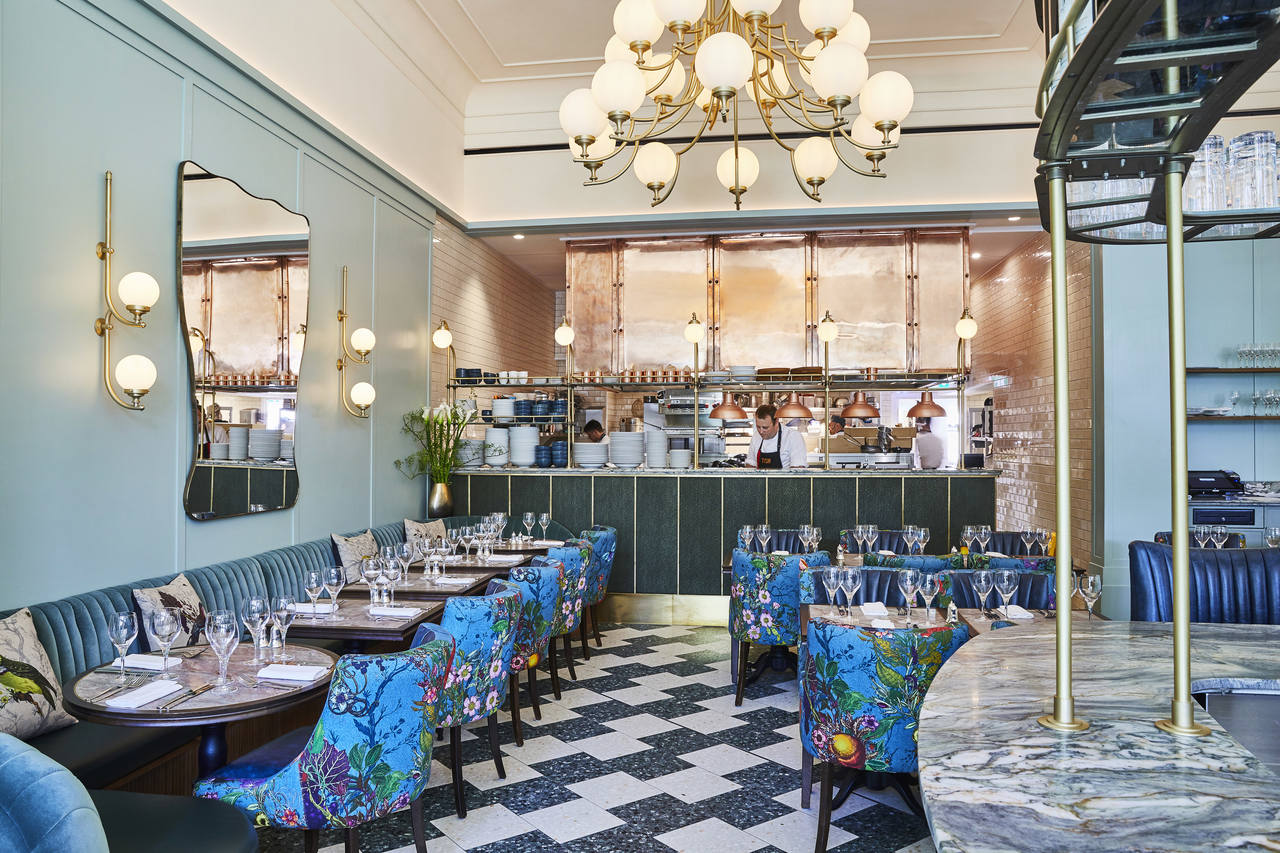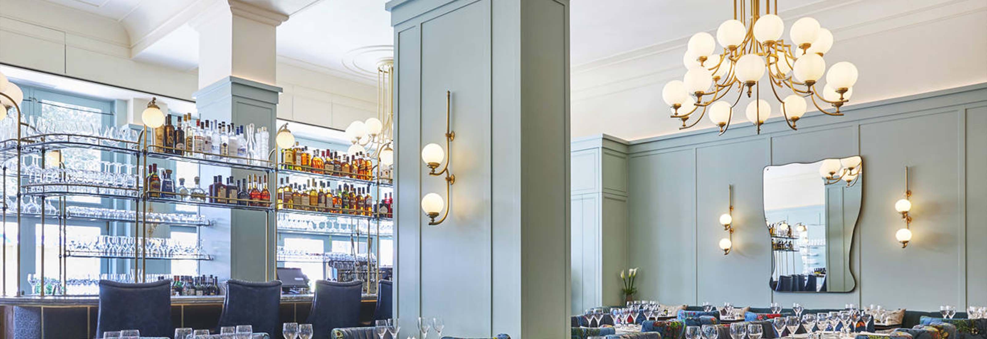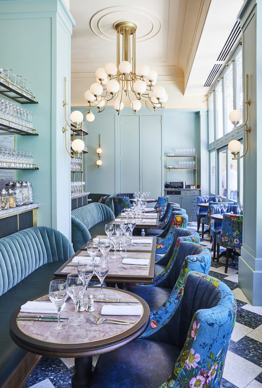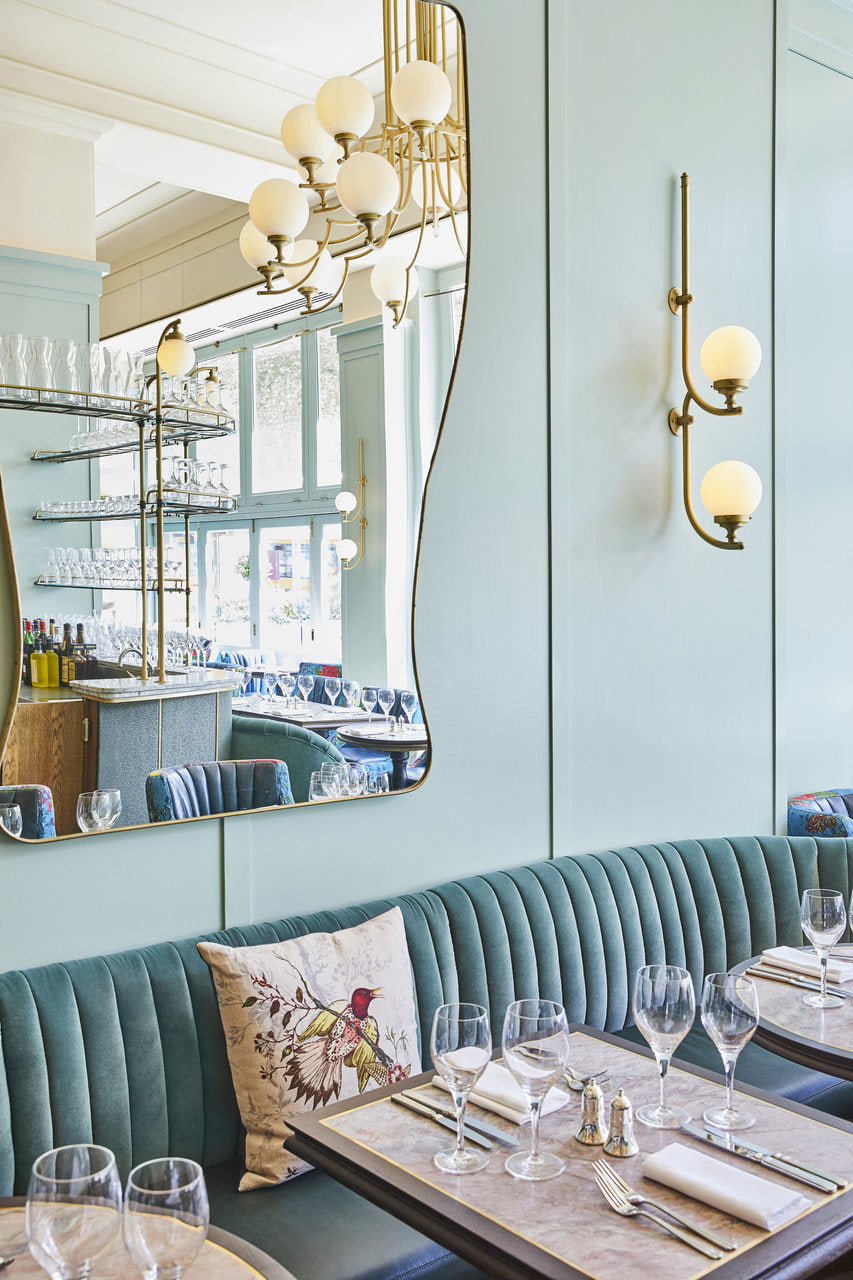 The high ceilings of the room frame the wall lights and chandeliers beautifully allowing them to be a real focal point of the interior. The layout and functionality of the room are very Parisian brasserie inspired, yet lifted and refreshed with quirky prints and a simultaneously bold and calming colour palette.