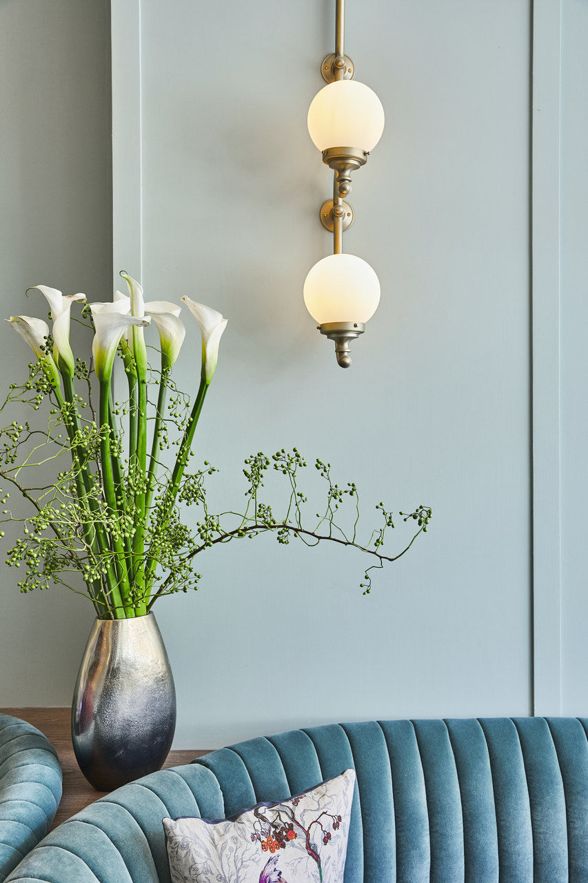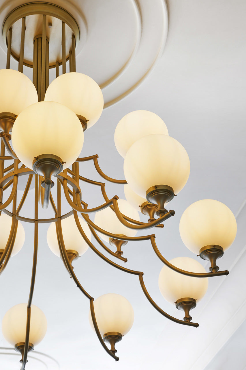 Inspired by Art Deco styles and fittings from last century, the bespoke wall lights and chandeliers have sweeping arms and exquisite detailing that comes finished in brass with hand-blown matt opal spheres which softly illuminate the interior. Each finial detail was machined individually for Tish Bar & restaurant, resulting in a truly bespoke collection of bespoke lighting.