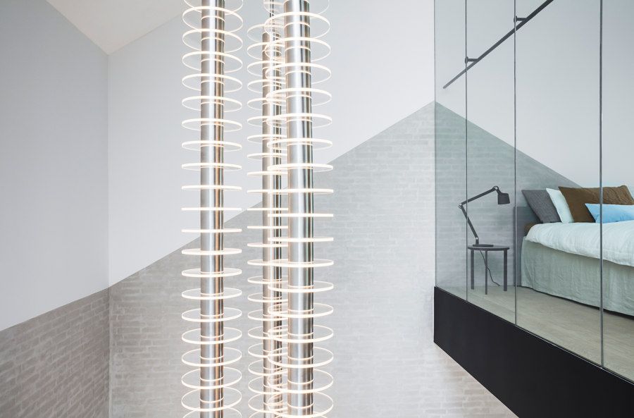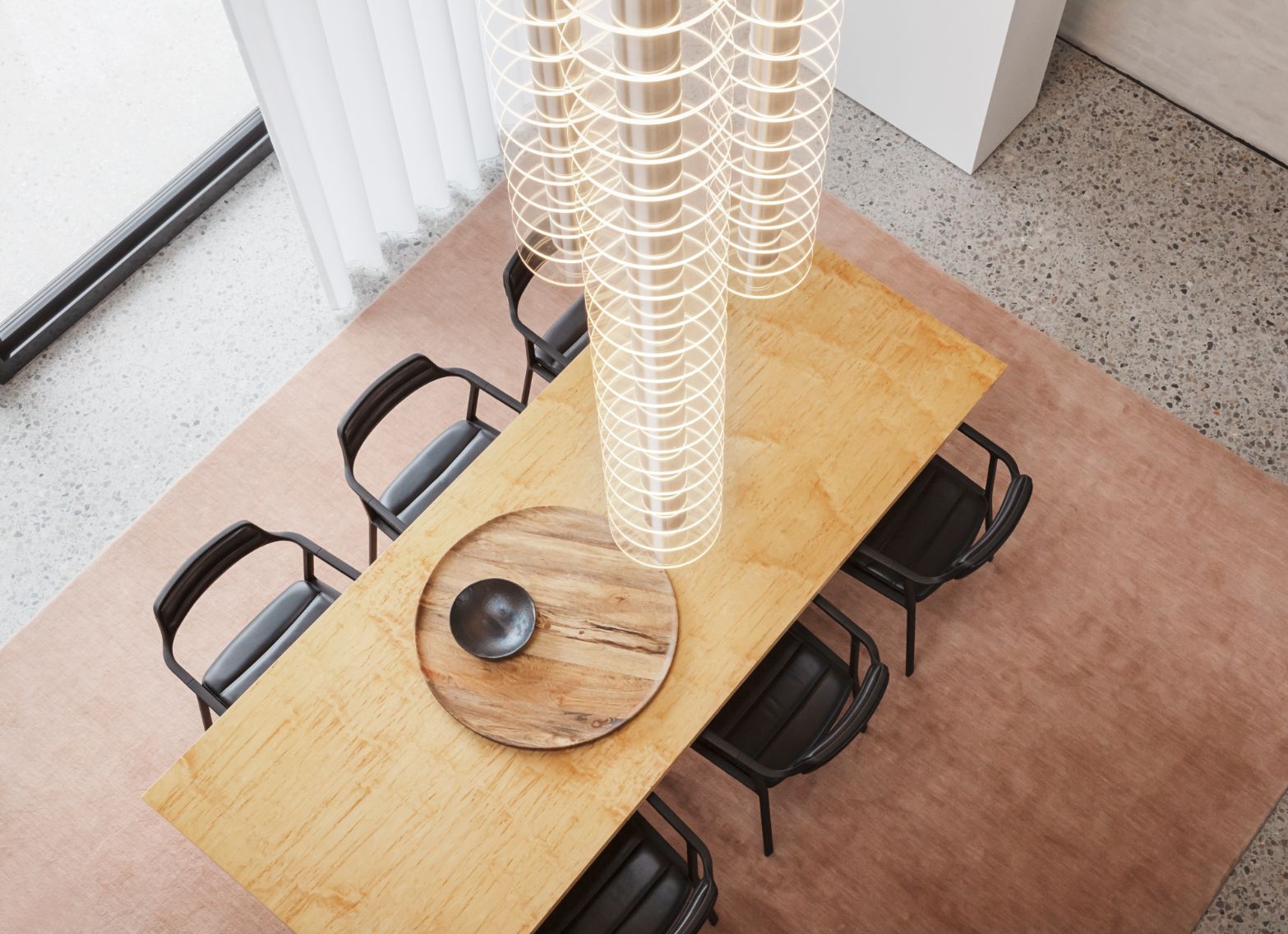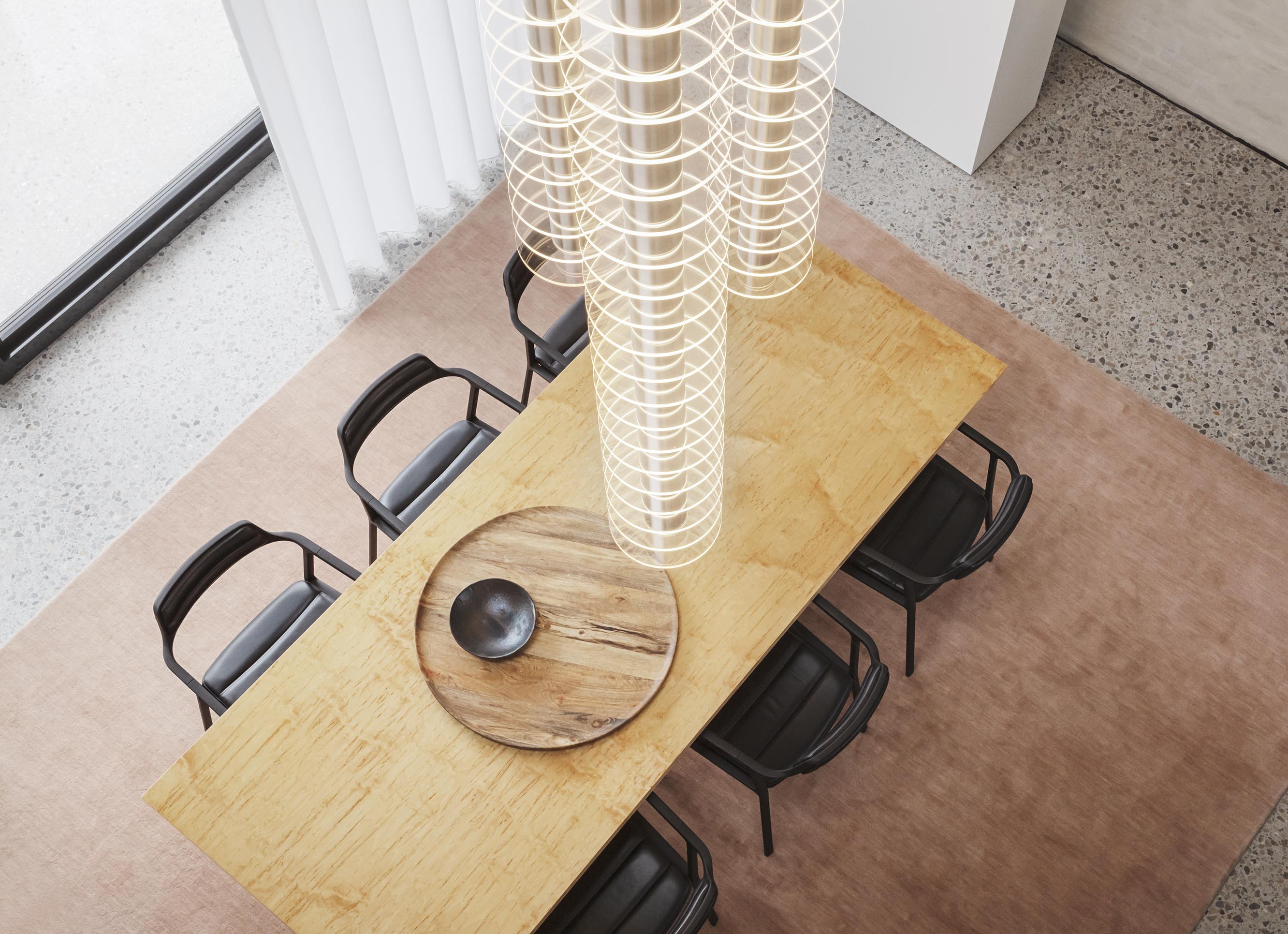 Northern Lights were instructed to realise Thulstrup's eye-opening design concepts for the contemporary interior. The real challenge was to create a lighting solution that met the purpose of practicality and would span across two floors, as well as adding a uniquely modern twist on residential lighting. The pitched roof of the new level is left exposed, and its generous height is accentuated by three identical five-metre long pendants comprising of tiered sandblasted Perspex discs, housed upon polished stainless steel poles. Our skilled artisans manufactured the showstopping pendants precisely so that they could suspend in harmony from the exposed roof.
