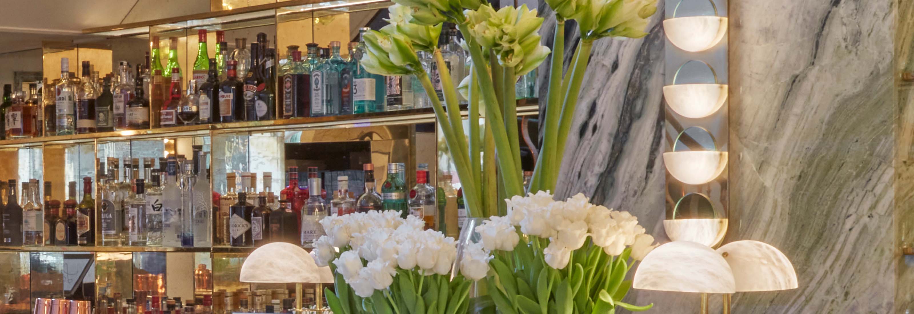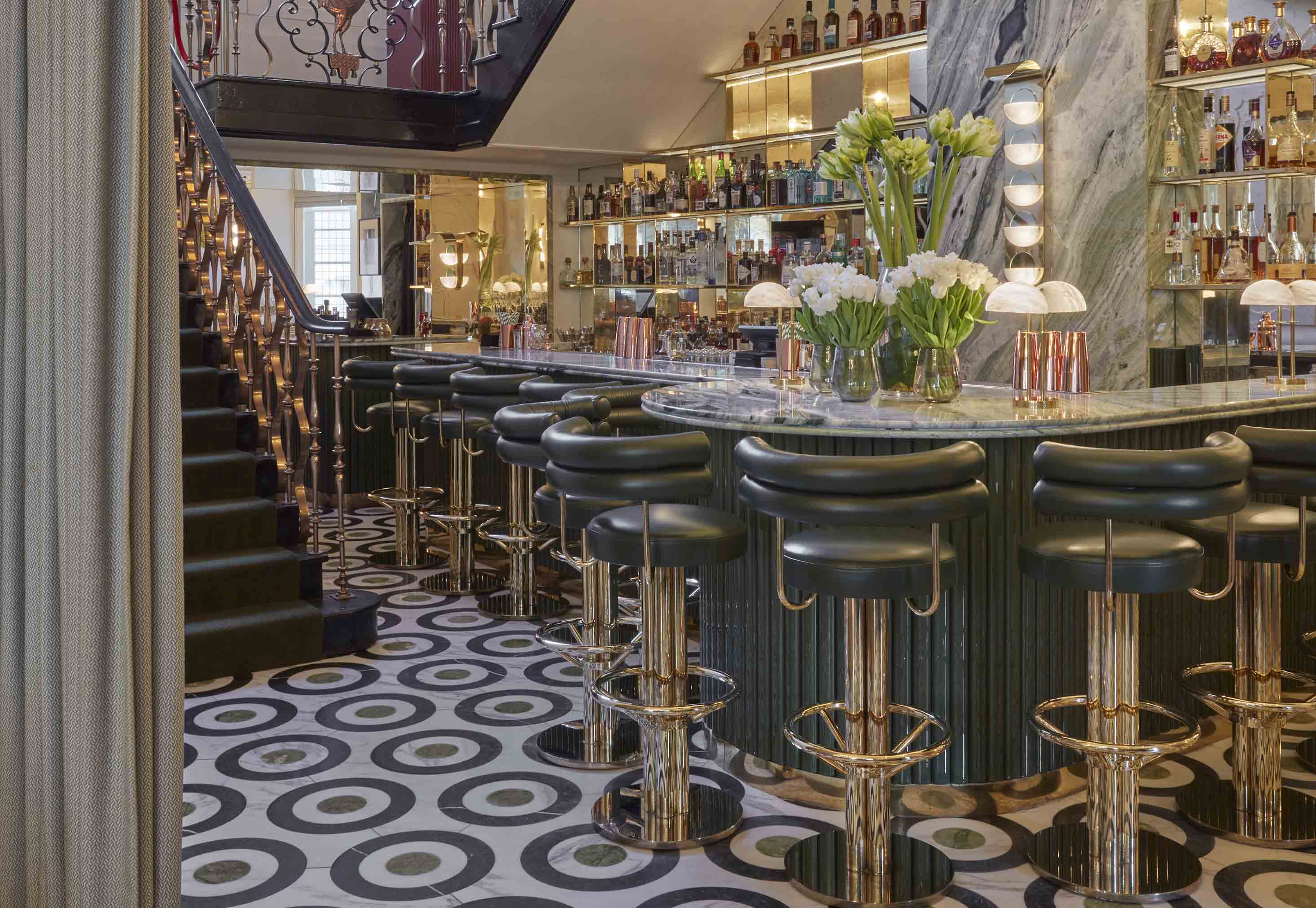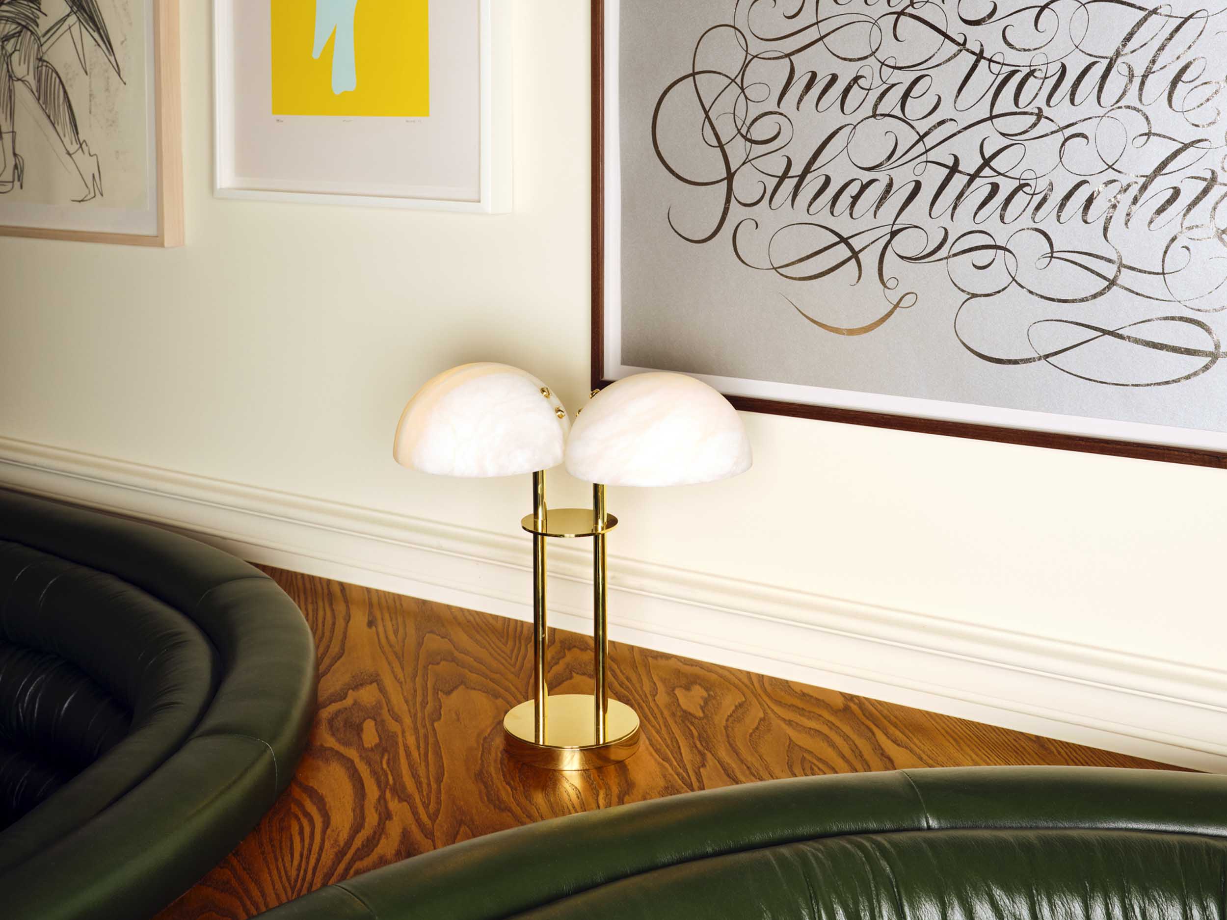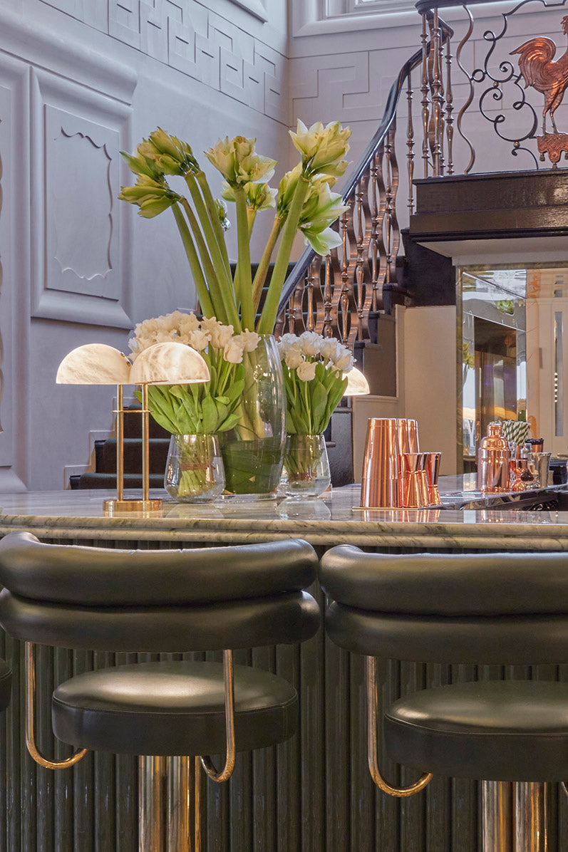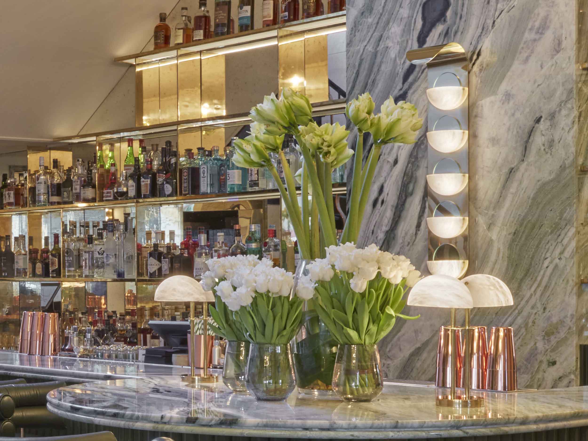 Stepping through Langan's hallowed doors, guests enter the ground floor bar. The floor, made from three different marbles, is adorned with a circular 'pop' pattern. The elegant cocktail bar, made from green ceramic noodle tiles, encompasses a stunning curved marble countertop. Our delicately finished countertop twin table lamps are genuine statement pieces that capture the essence and elegance of the exclusive bar area by pairing richly-veined and fully bespoke alabaster domes with polished brass stems and bases.
