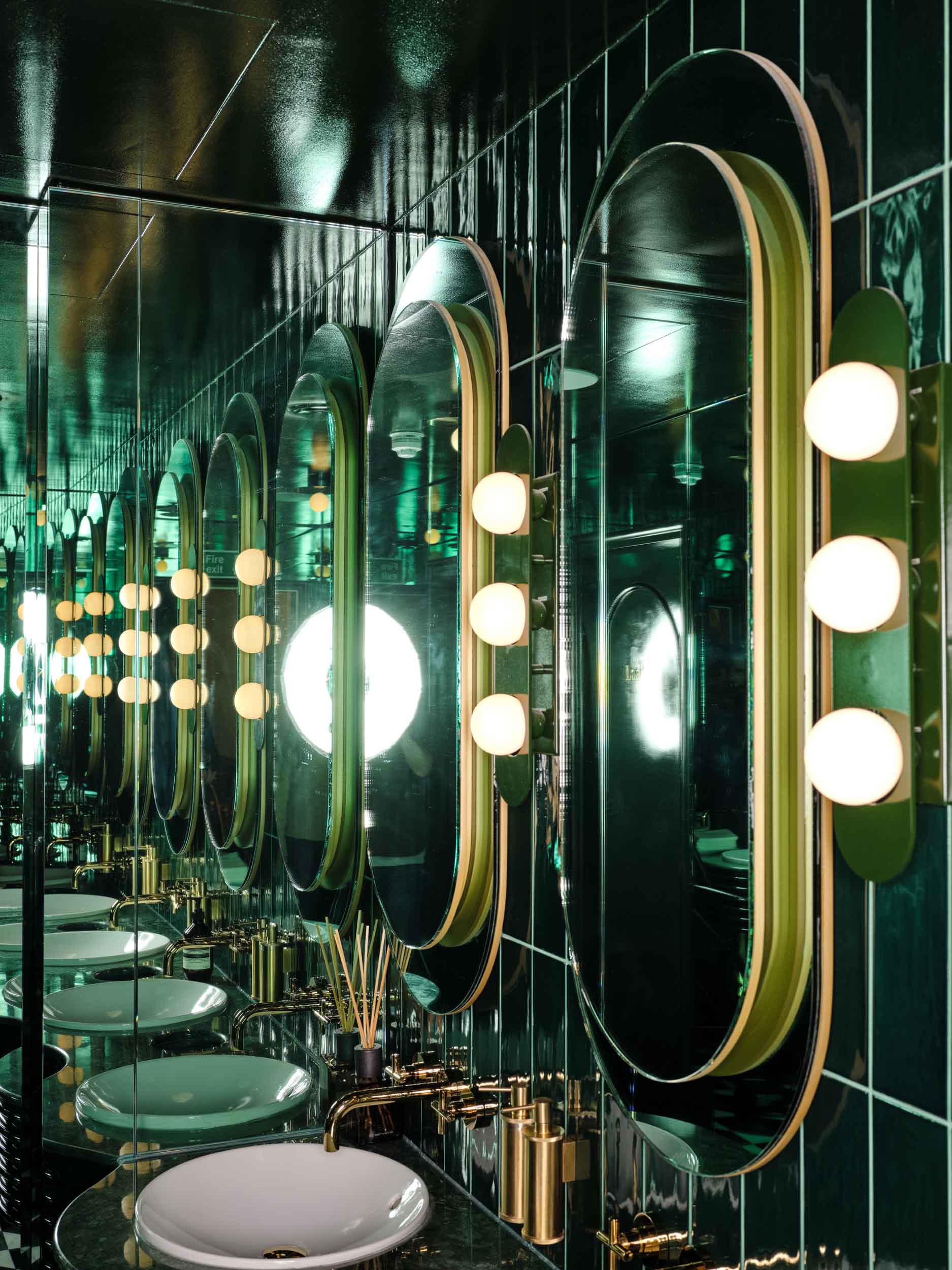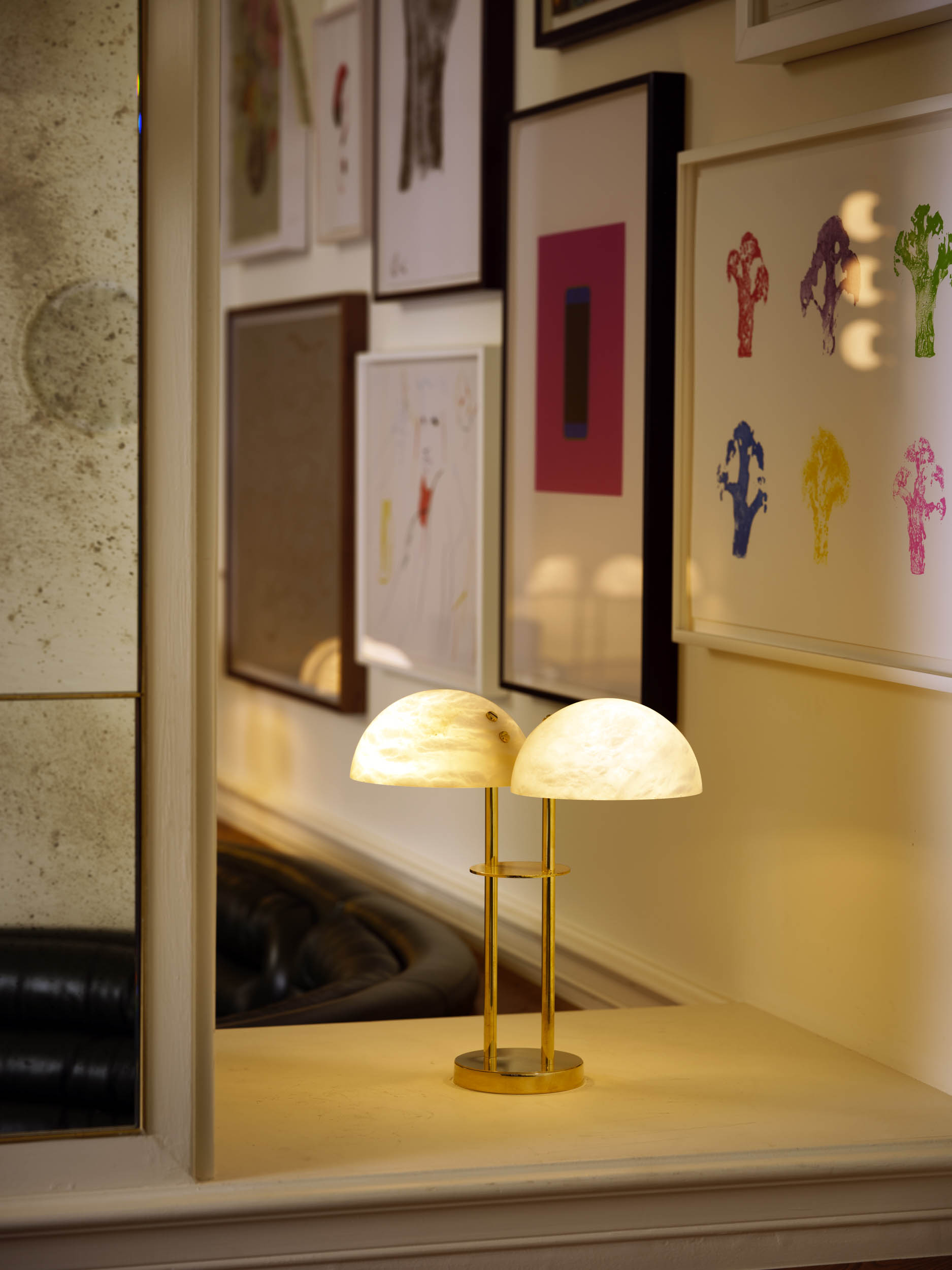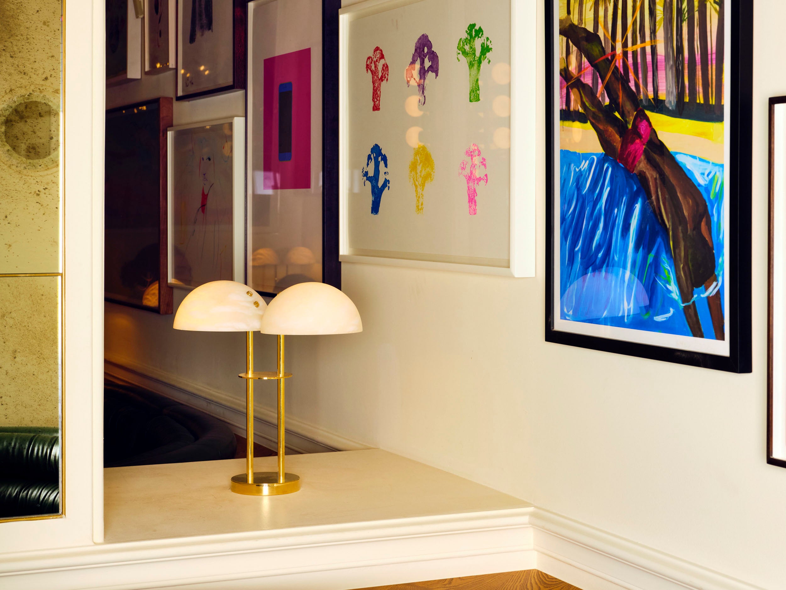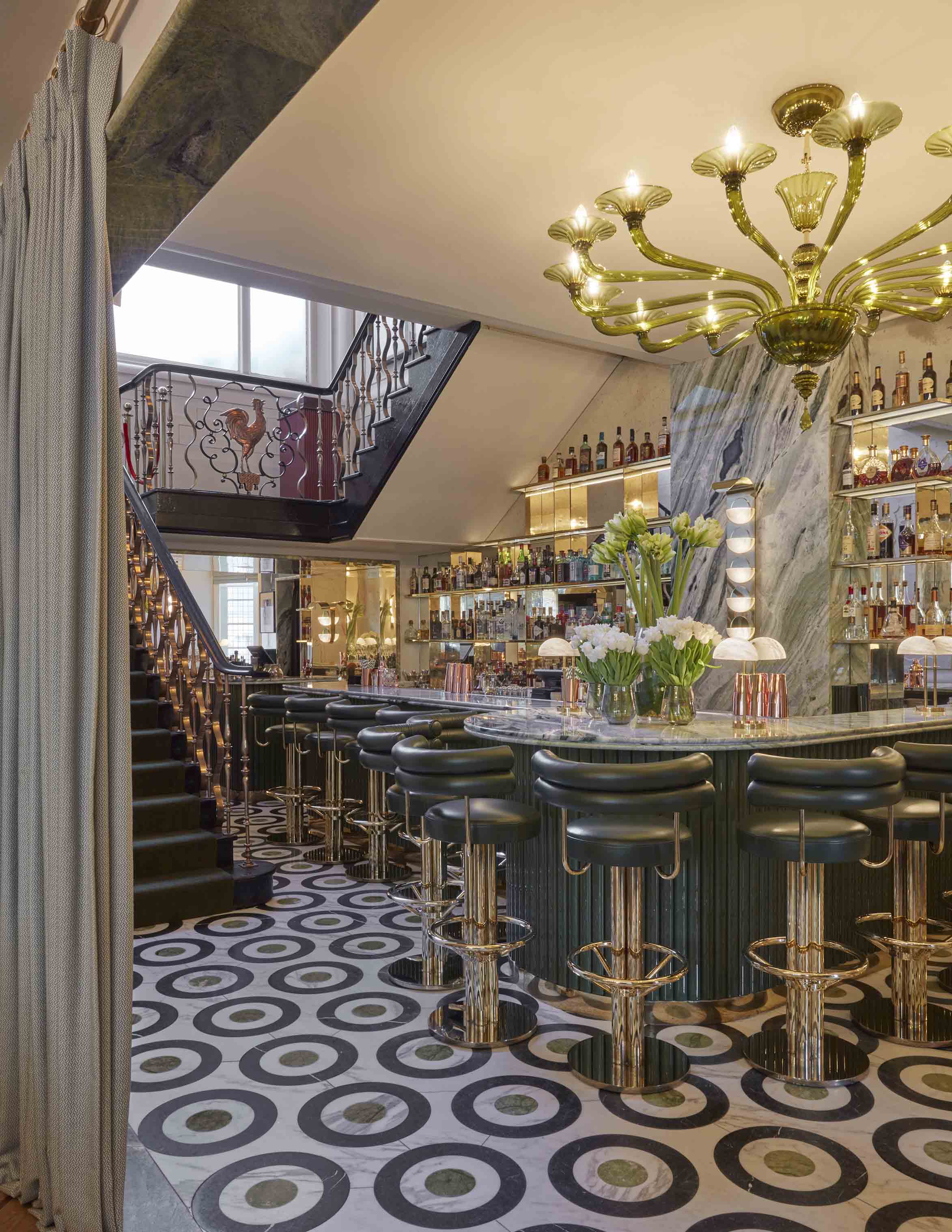 Stepping through Langan's hallowed doors, guests enter the ground floor bar. The floor, made from three different marbles, is adorned with a circular 'pop' pattern. The elegant cocktail bar, made from green ceramic noodle tiles, encompasses a stunning curved marble countertop. Our delicately finished countertop twin table lamps are genuine statement pieces that capture the essence and elegance of the exclusive bar area by pairing richly-veined and fully bespoke alabaster domes with polished brass stems and bases.