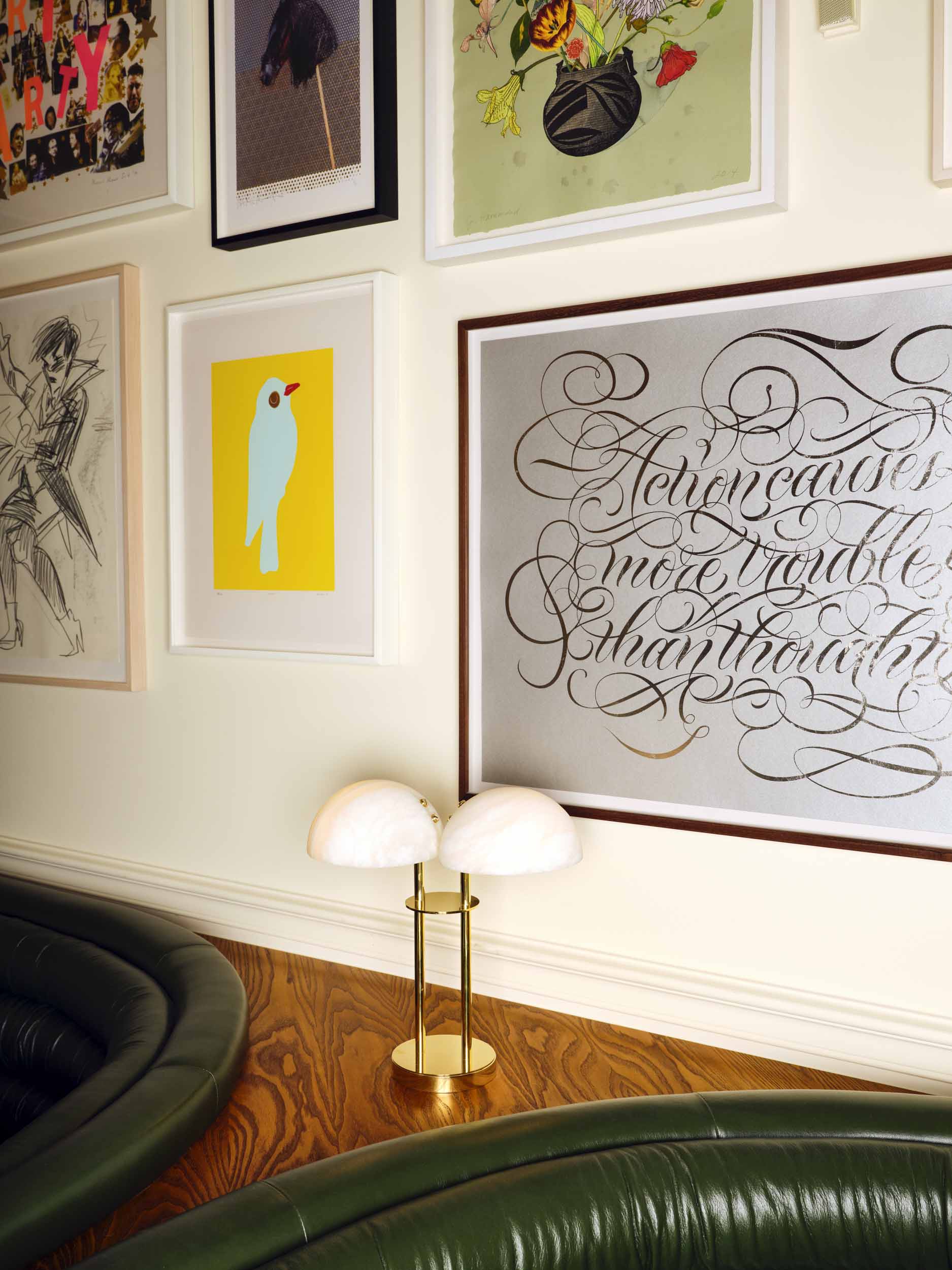 On the ceiling areas between each mirrored pillar, our elegant flush mount alabaster and polished brass ceiling lights provide a well-distributed lighting source that haloes the vast array of original prints that sit on the wall beneath them.
