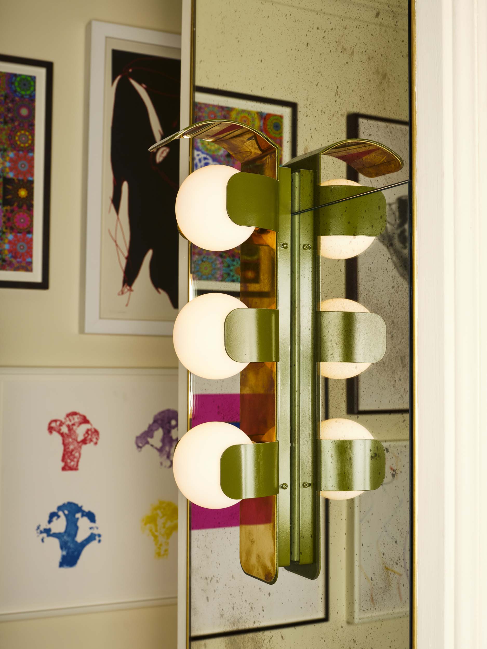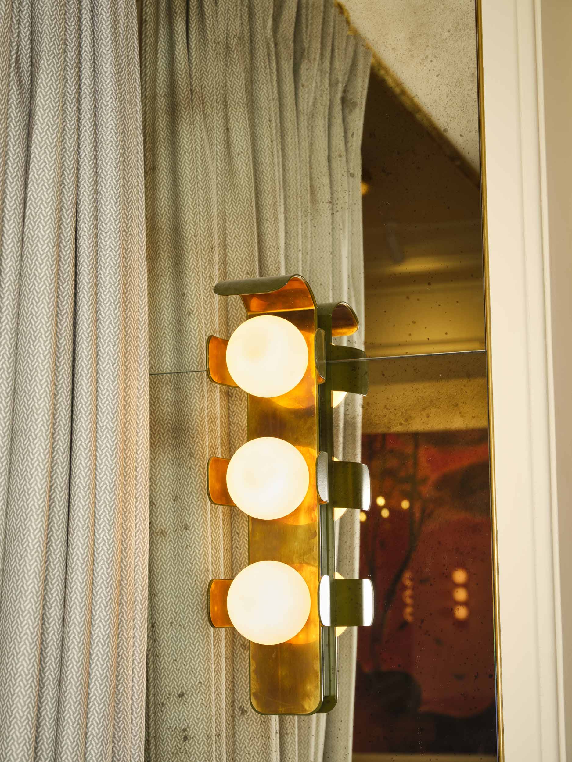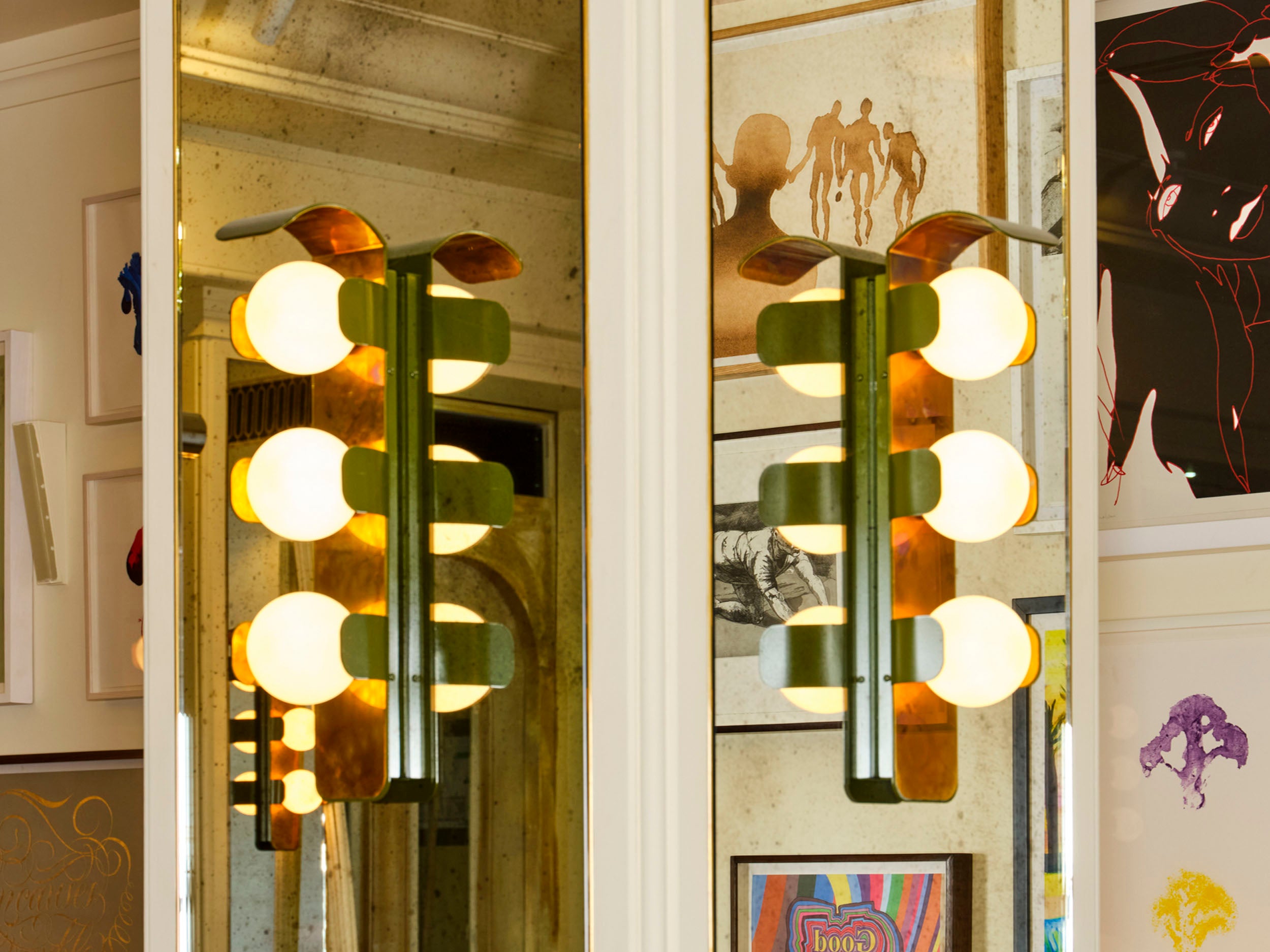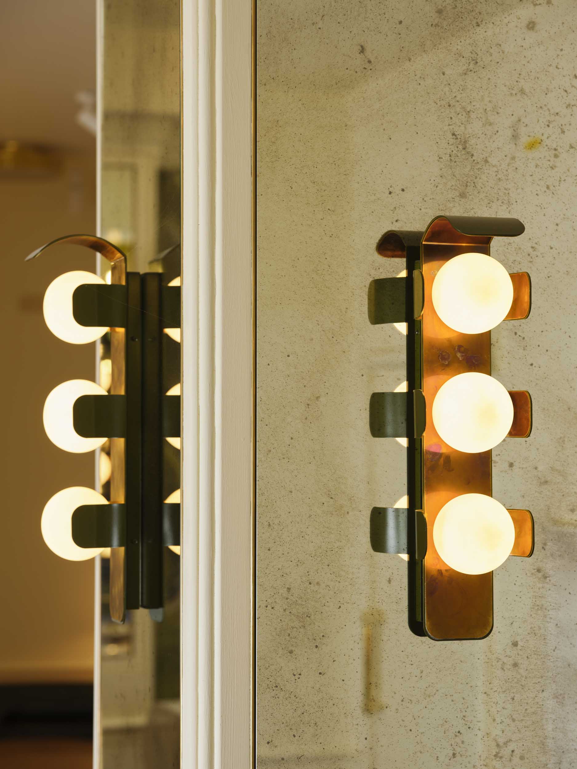 The most sizeable of our fixtures comes in the form of a 5-light wall installation that comprises a handcrafted polished brass frame, green & silver Preedy Mirror Glass discs and white alabaster shades. The fixture encapsulates the very essence of the restaurant's interior by capturing the opulence of the materials, palettes and aesthetic on display and transforming each element into a bespoke lighting piece that provides both magnificence and operation.