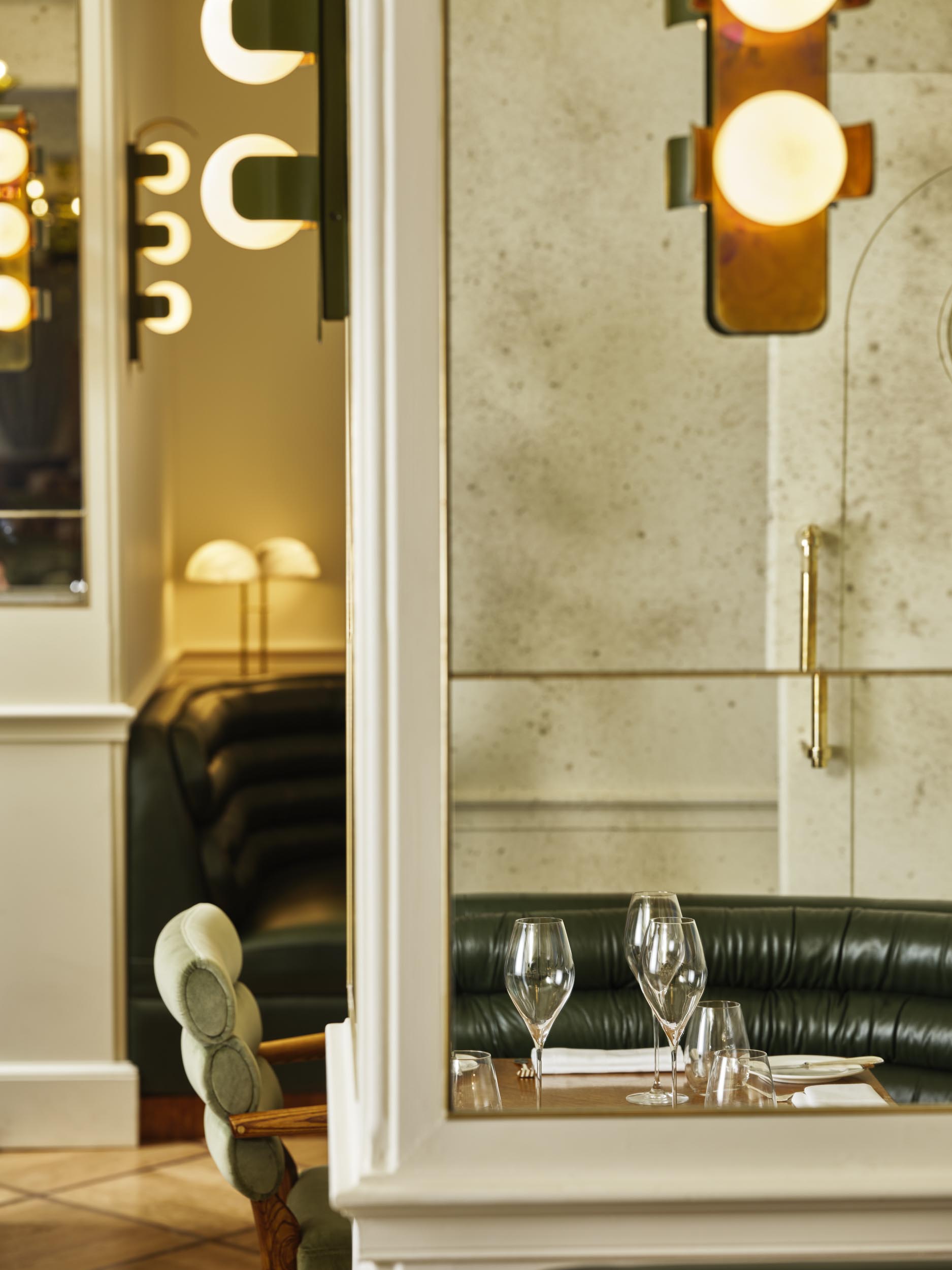In the main dining room, which sits to the left of the entrance, a palette of sage green is offset by neutral accents. Luxurious soft green banquettes, made from English leather, line the wall, while the Brasserie's marble tables are positioned against a backdrop of original 1920' brass windows, illuminated by the distinctive chandeliers from Venini in Murano.