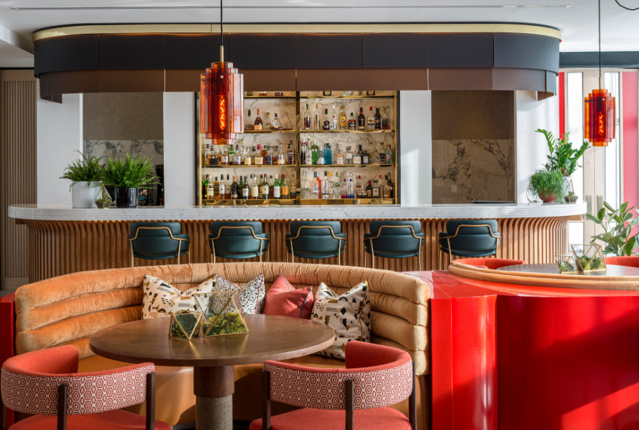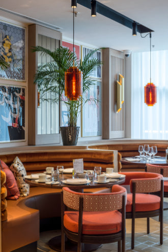 The mix of bright & graphic abstract gallery artworks complements the rich interior, with slimline brass frames for added glamour, balanced with greenery for relaxed and natural surroundings. Goddard Littlefair was announced as the winner of the 2020 Restaurant & Bar Design Awards - Hotel Category for their work on The River Restaurant.